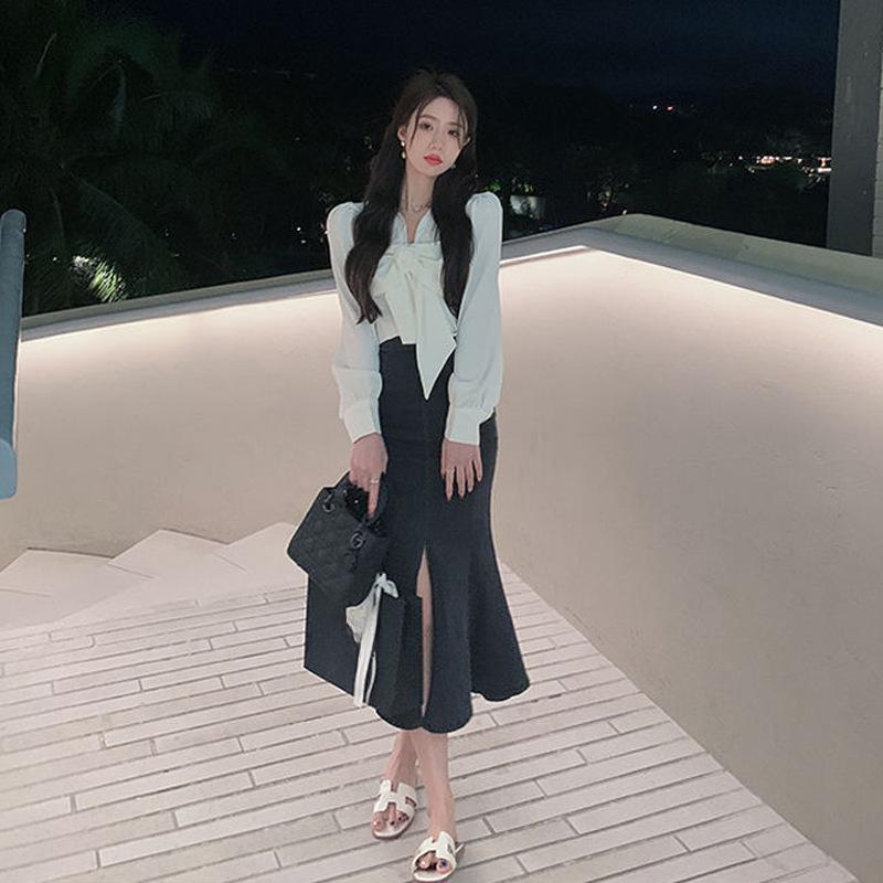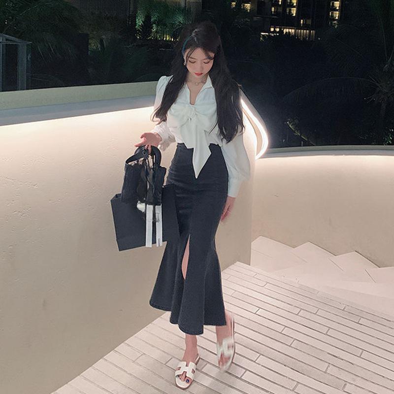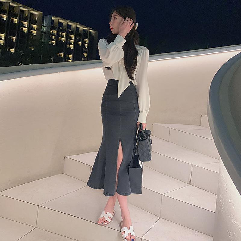 Элегантная черная оборка открытая женская летняя юбка с высокой талией, облегающая, эластичная, средней длины, юбка-бюстье из денима