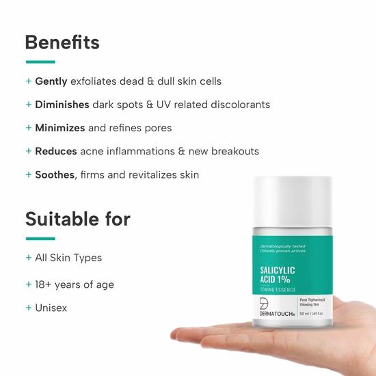 DERMATOUCH Салициловая кислота 1% W/W Тонизирующая эссенция в каплях | Для сужения пор и сияния кожи | Для ровной и обновленной кожи | Для мужчин и женщин | 50 мл