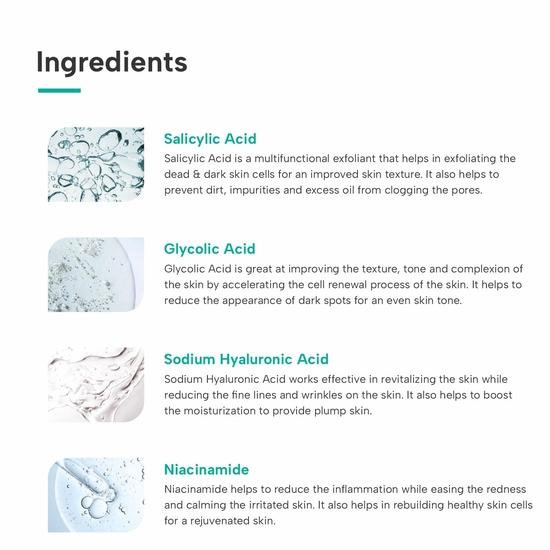 aqua, propanediol, glycerin, salicylic acid 1% w/w (and) dextrin (and) polydextrose (and) amylopectin (and) niacinamide, peg-40 hydrogenated castor oil, sodium benzoate (and) potassium sorbate (and) aqua, glycolic acid, niacinamide, heptyl glucoside, sodium gluconate, sodium hyaluronate.