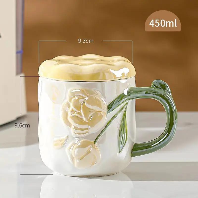 Керамическая кружка-тюльпан с перламутровой глазурью и крышкой, расписанная вручную рельефная кофейная чашка с изображением цветов для девочек, подарочные семейные кружки