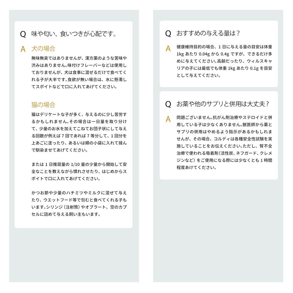 Cordy G — это добавка, поддерживающая здоровье животных, содержащая порошок культивированного кордицепса китайского.. Cordyceps sinensis, выращиваемый в Японии, выращивается на заводе в Японии, и продукт производится, включая весь мицелий, плодовые тела и вторичные метаболиты.. Кордицепс китайский — это ингредиент, который, как ожидается, восстанавливает первоначальную силу животных.. Cordi-G — это добавка, которая может быть полезна в сочетании с хирургическим вмешательством или приемом лекарств, а также сама по себе.. Завод-изготовитель Monolith Co., Ltd. имеет сертификат GMP (Надлежащая производственная практика) сертифицирован в соответствии с Руководством по здоровому питанию Министерства здравоохранения, труда и социального обеспечения и производит продукт от начала до конца, вплоть до розлива. Мы также провели испытания на безопасность в организации, соответствующей стандартам GLP, чтобы подтвердить отсутствие проблем.. Мы также регулярно проводим ДНК-тесты нашей продукции, чтобы убедиться, что она изготовлена из высококачественного кордицепса китайского.. Если из-за непредвиденных обстоятельств остались нераспечатанные товары, мы примем возврат и возмещение средств.. Контактная информация указана в прилагаемой брошюре, поэтому, пожалуйста, свяжитесь с нами.. В комплект входят мерная ложка и инструкция.