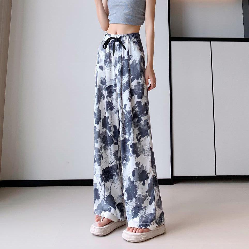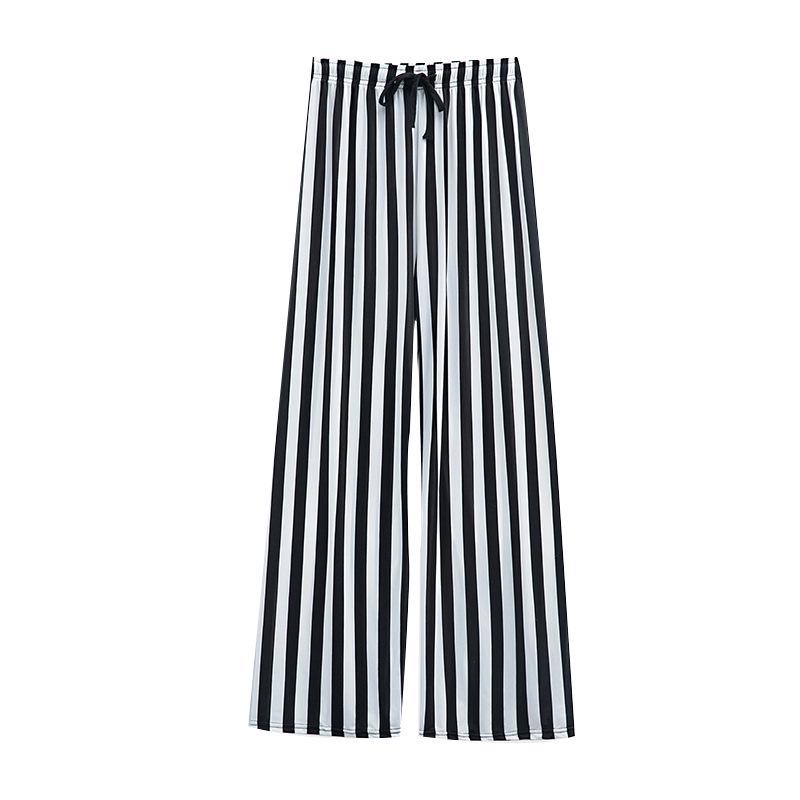 Женские летние брюки широкого кроя с высокой талией в черно-белую полоску — стиль «рисование тушью», облегающий крой, свободные повседневные брюки из ледяного шелка с драпировкой.