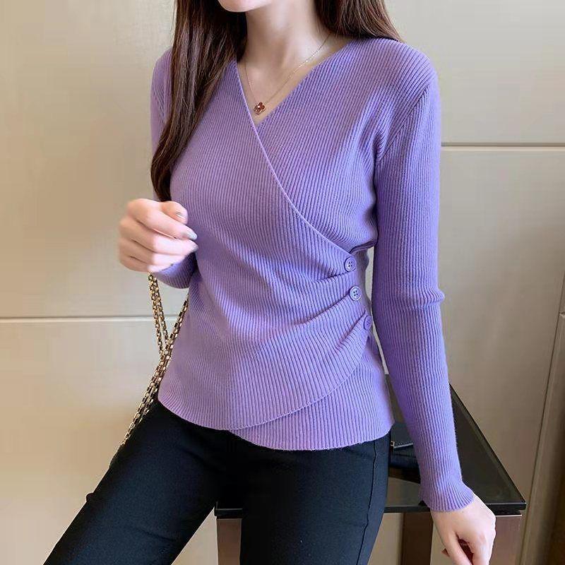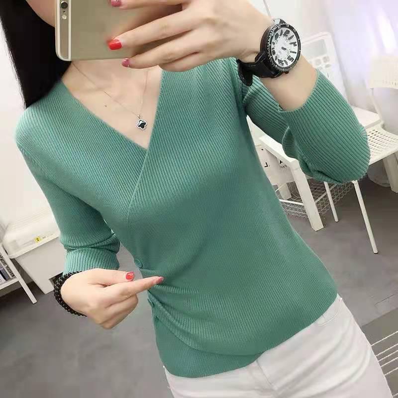 Корейский облегающий свитер с V-образным вырезом на весну и осень - женский топ с длинными рукавами