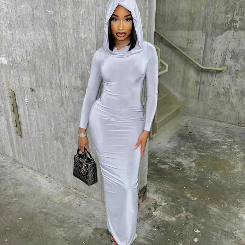 Ощутите элегантность и стиль в этом шикарном облегающем платье с капюшоном и длинными рукавами, которое идеально подойдет как европейским, так и американским ценителям моды.. Изготовленный из роскошного искусственного шелка, он обеспечивает гладкую и удобную посадку, подчеркивая изгибы вашего тела.. Уникальная отделка из молочного шелка придает изделию нотку изысканности, делая его обязательным дополнением к вашему гардеробу.. Это однотонное платье идеально подойдет для любого случая, оно легко сочетает в себе комфорт и стиль, позволяя вам уверенно выделяться.