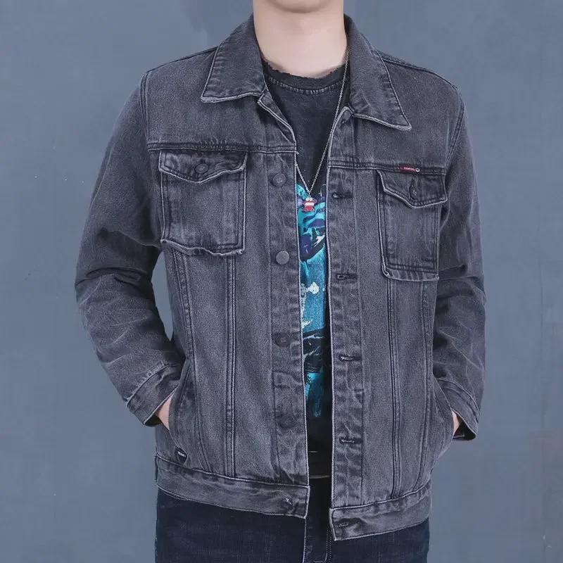 Мужская черная джинсовая куртка весна 2023: Модный корейский стиль, износостойкий, с отворотом