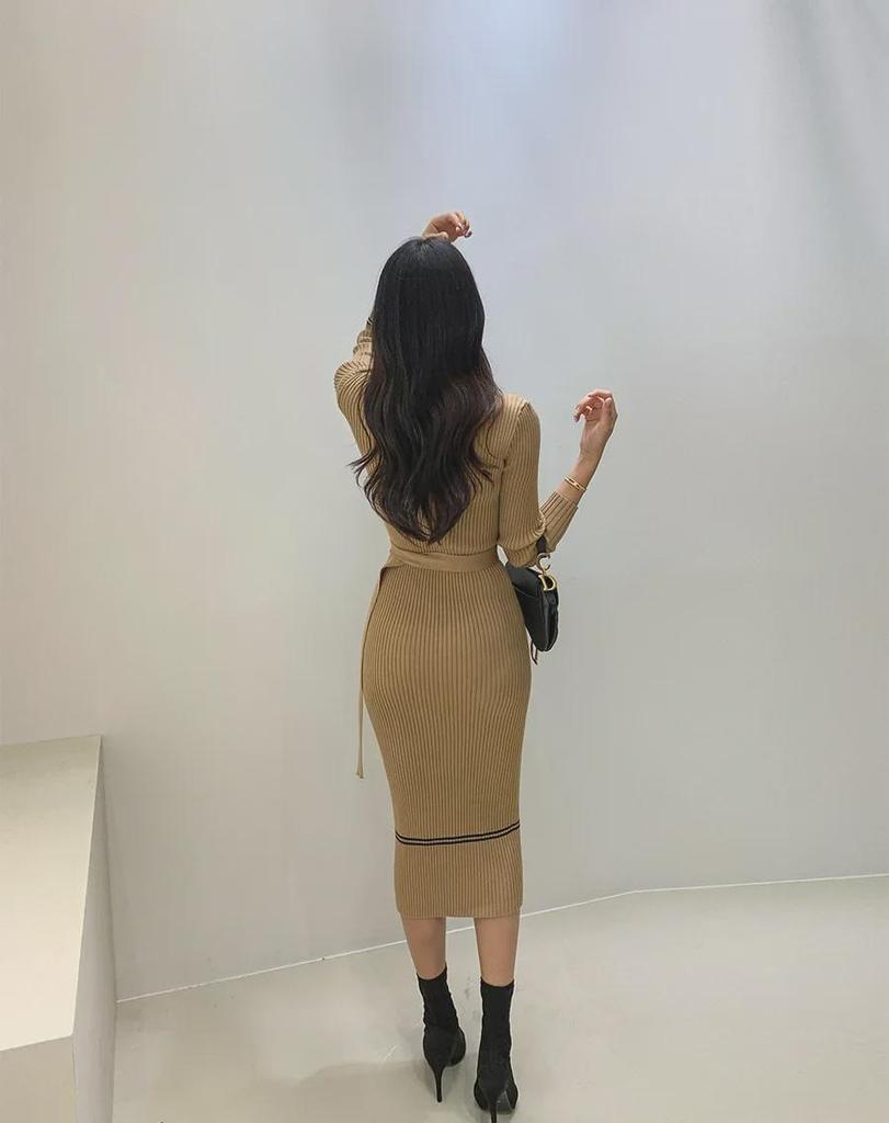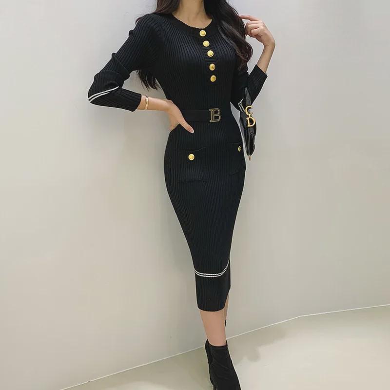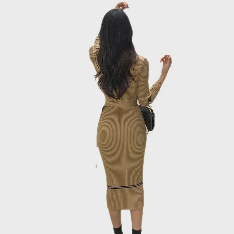 Женское трикотажное платье в корейском стиле: 2023 Осень/Зима, Круглый вырез, Длинный рукав, Карман, Галстук, Контрастные цвета