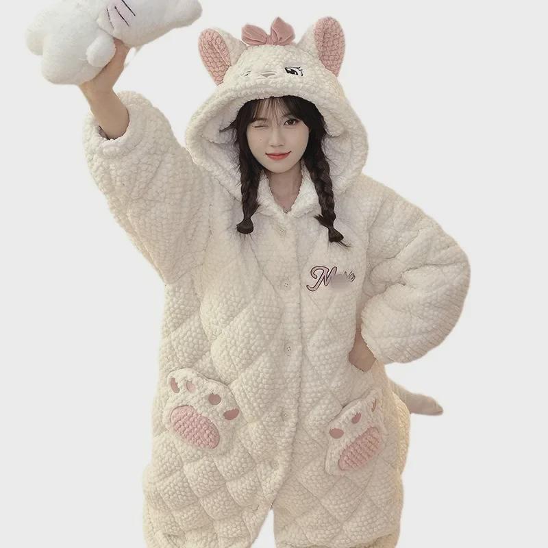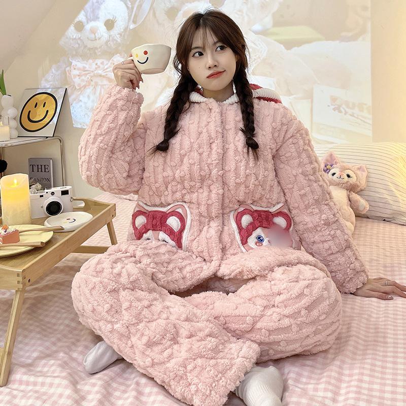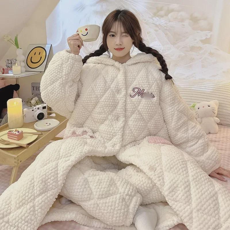 Женский трехслойный стеганый пижамный комплект: Фланелевая куртка с капюшоном, зимняя ночная рубашка, халат и плотные брюки больших размеров.