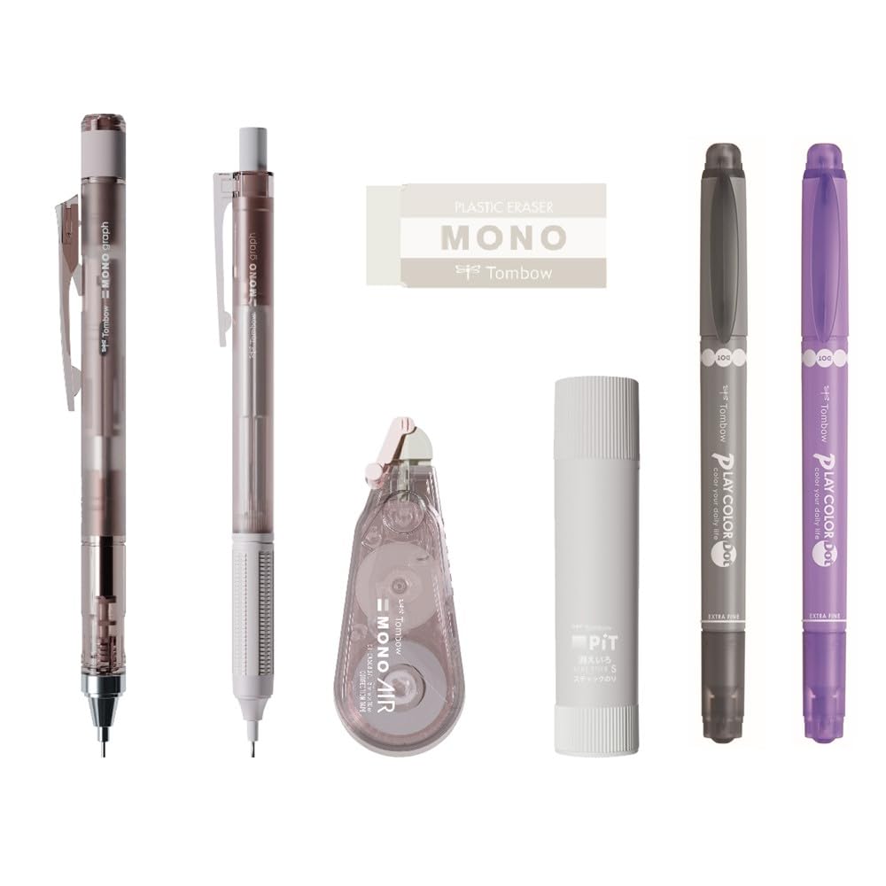 Карандаш Tombow MONO x PiT Канцелярский набор из 7 предметов Пастельное стекло Коричневый карандаш x Клей Корректирующая цветная ручка x (Механический 0,5 мм 2, Ластик, Палочка, Лента,
