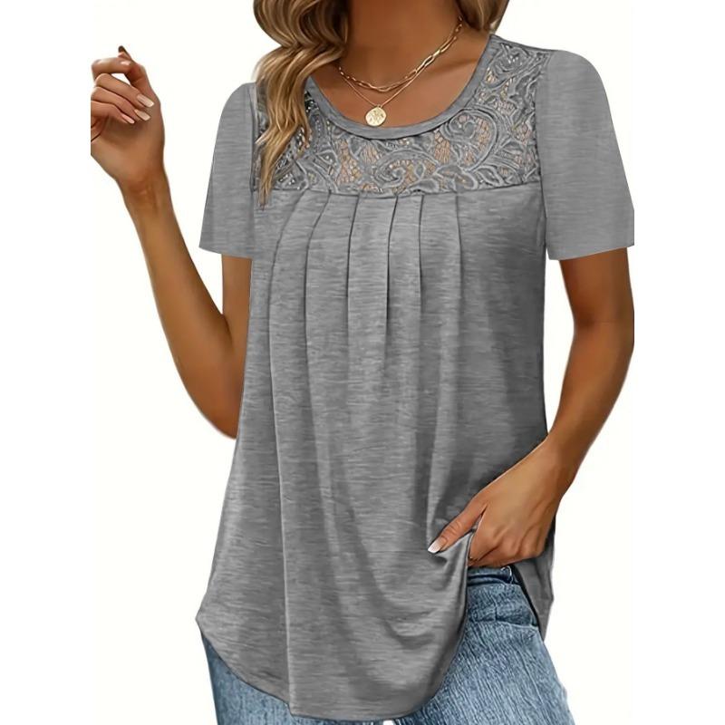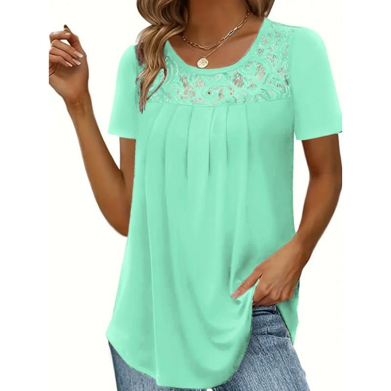 Женская модная однотонная футболка с короткими рукавами и кружевом, с верхним воротником