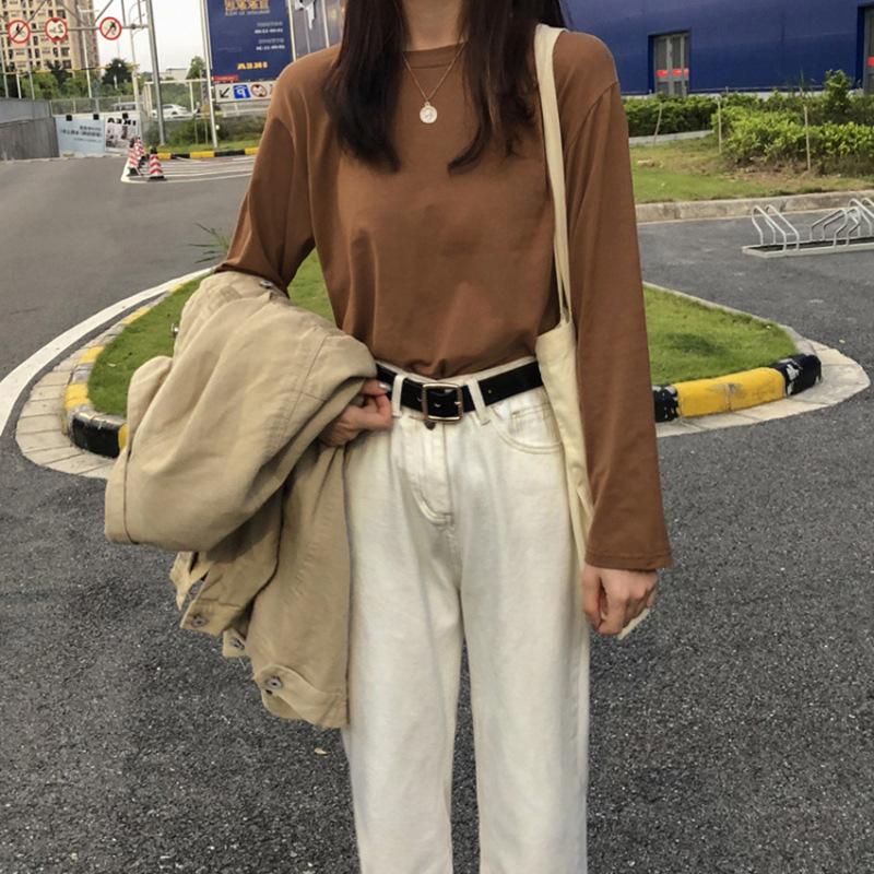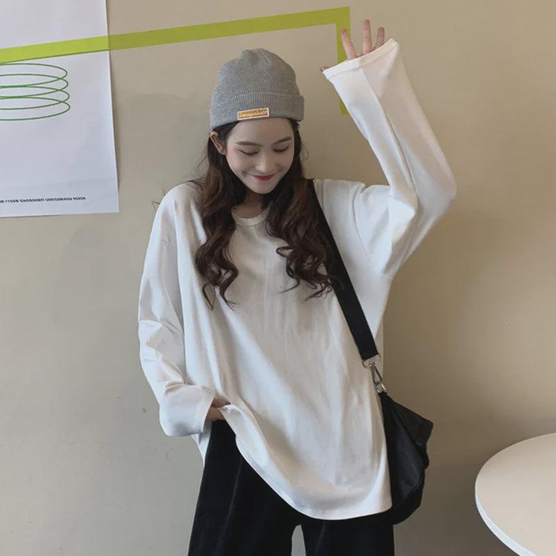 Весна 2025 г. Свободная футболка в корейском стиле с длинными рукавами и круглым вырезом для женщин