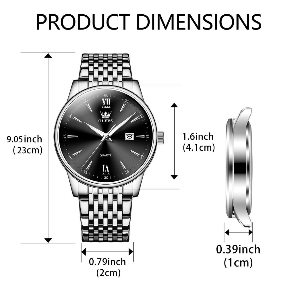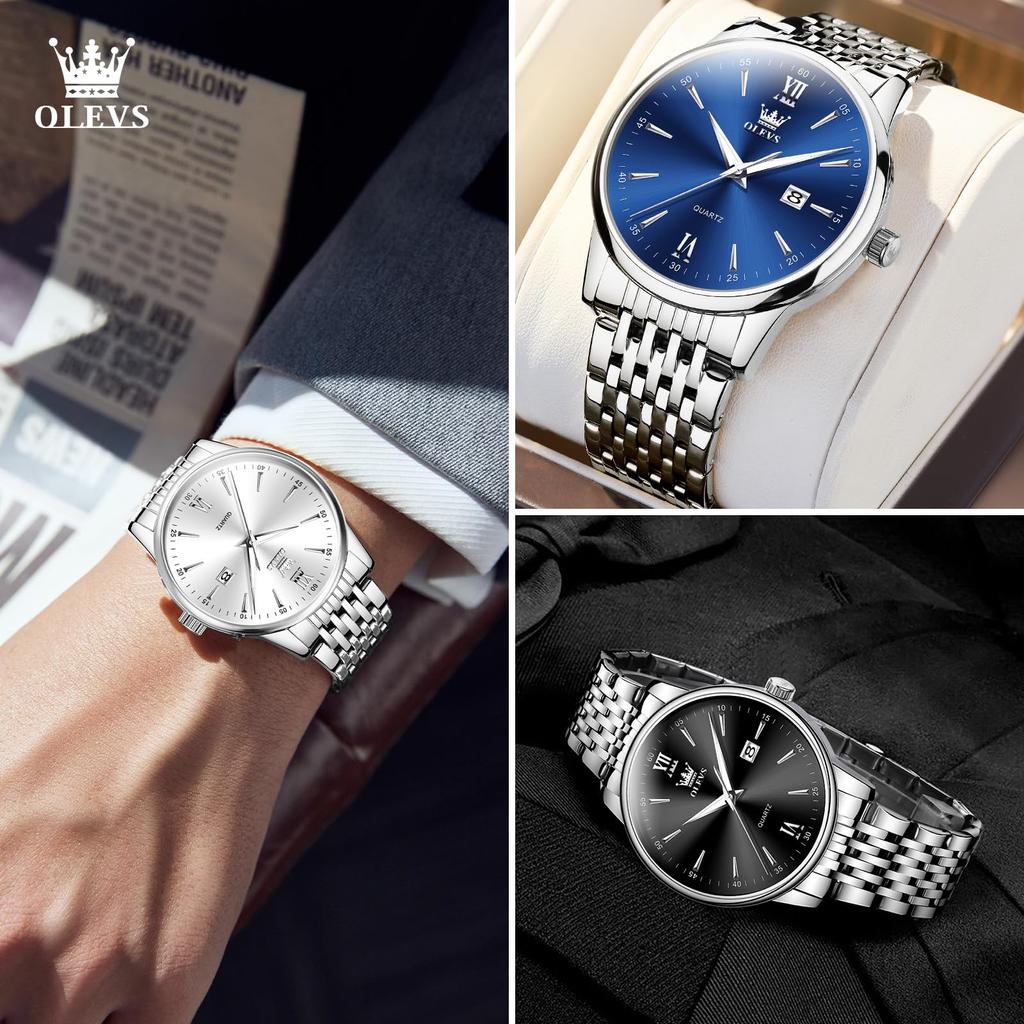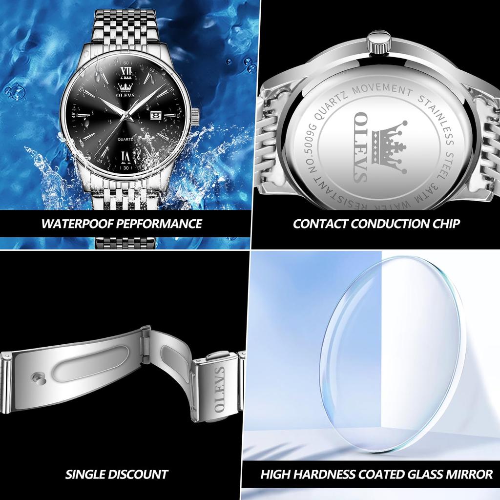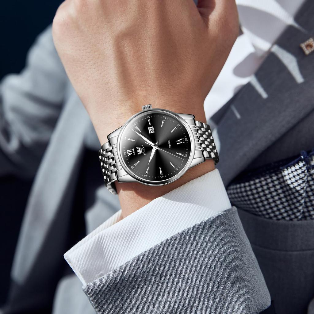 OLEVS Модные Популярные Черные Кварцевые Часы Аналоговые Деловые Рабочие Водонепроницаемые Часы Серебристый Ремешок из Нержавеющей Стали Модные Часы Крутые Часы с Черным Циферблатом