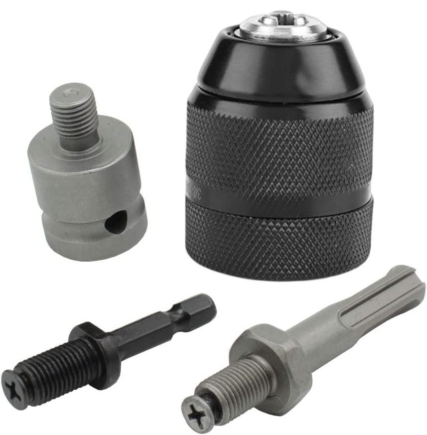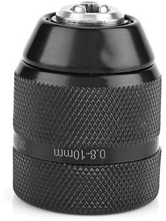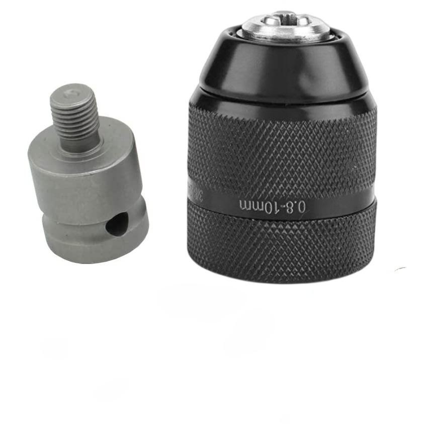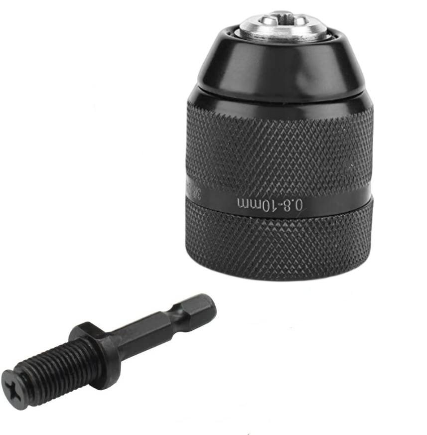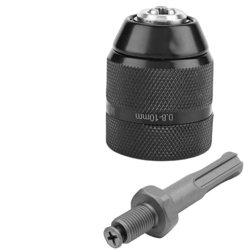 Цельнометаллическая электрическая дрель с 10-миллиметровым патроном с ручным зажимом, ударным молотком и шестигранной ручкой-переходником.
