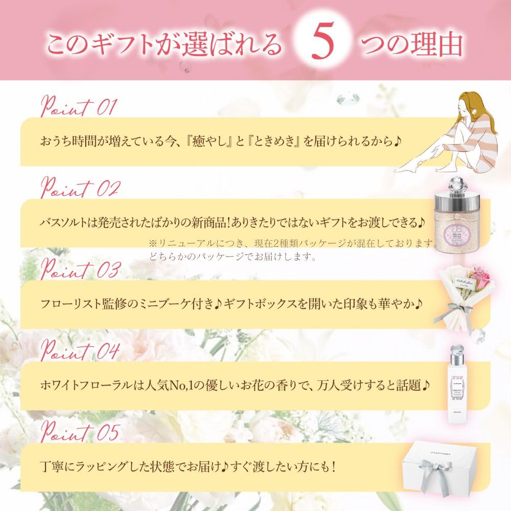 ✅ [Подарок, который заставит ваше сердце трепетать ♪] Популярная серия ароматов [White Floral] от JILLSTUART теперь выпустила ``Bath Salts'' ♪ Этот набор, главным героем которого является соль для ванн, включает в себя популярное молочко для тела, которое незаменимо во время ухода за телом, и ``Original Mini Bouquet'', который добавляет нотку гламура в тот момент, когда вы его открываете, чтобы создать захватывающий подарок, полный волнения ♪