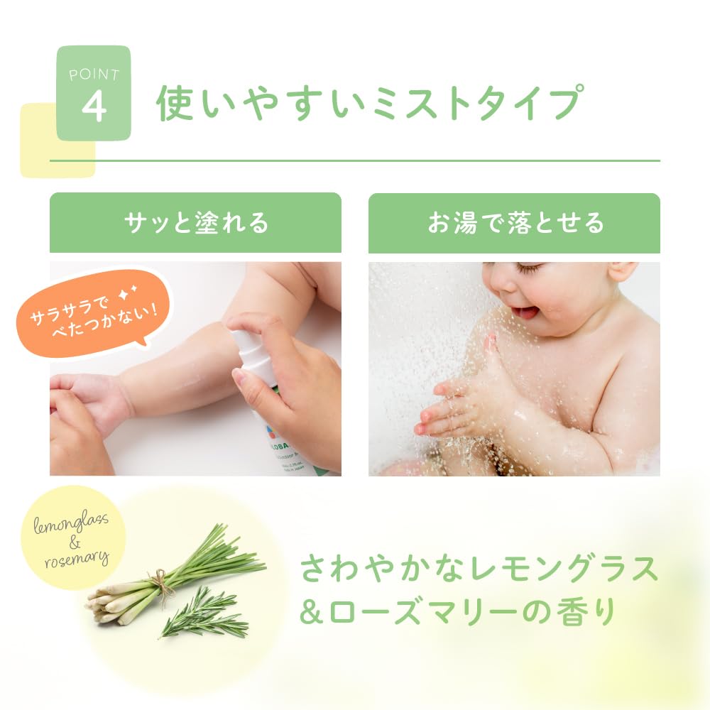 [Спрей 2 в 1 от УФ-излучения и для улицы] Этот спрей 2 в 1 обеспечивает защиту от УФ-излучения и защиту от солнца на открытом воздухе, что упрощает уход за младенцами и детьми, которые находятся в движении, перед выходом на улицу в напряженный день. Легко носить с собой и легко наносить повторно, даже для детей, которые легко потеют.