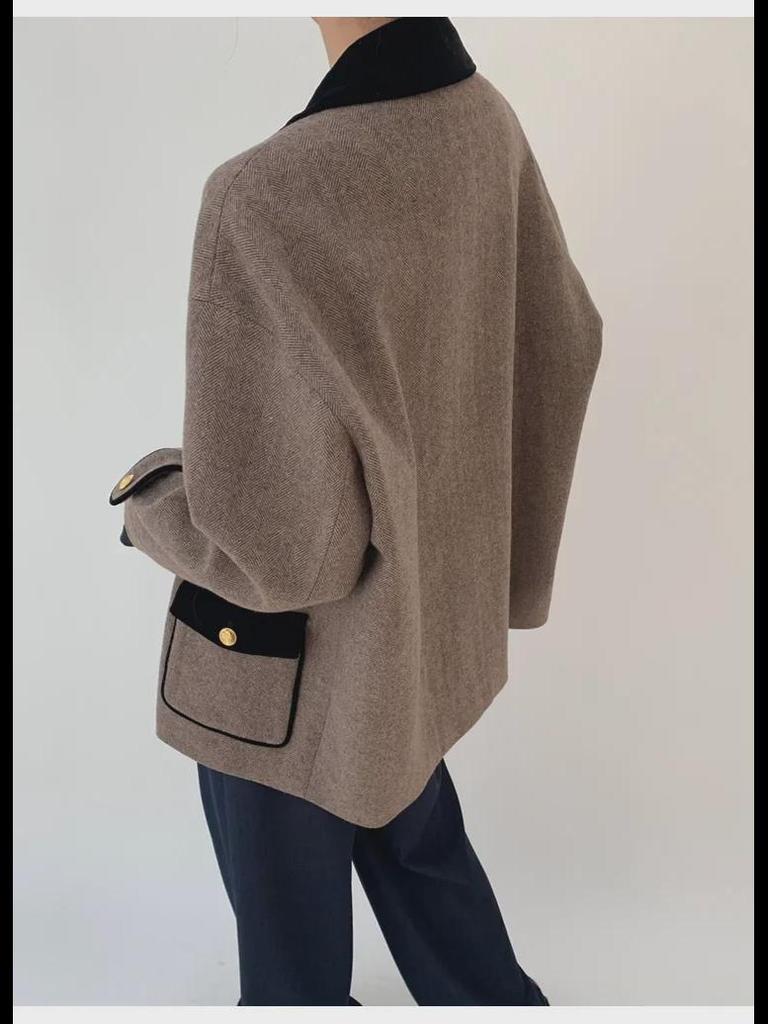 Женская шерстяная куртка-пальто из твила с контрастной строчкой и бархатом - мода осень/зима