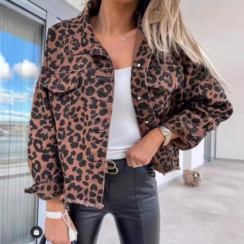 2022 Леопардовый принт Длинный рукав Джинсовая куртка Топ