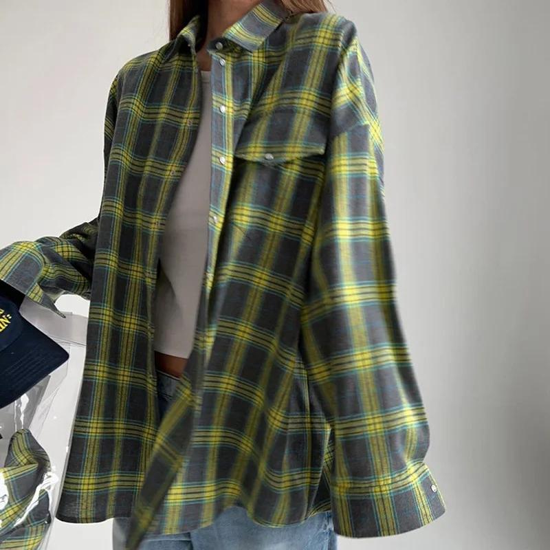 Рубашка оверсайз в клетку осенняя женская винтажная с длинным рукавом модная свободная с карманом посадка блузка — купить товар онлайн с бесплатной доставкой по всему миру!