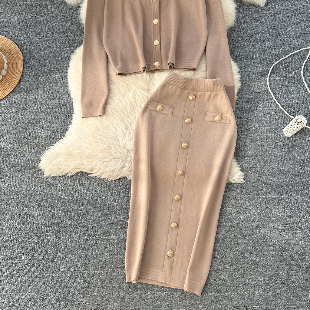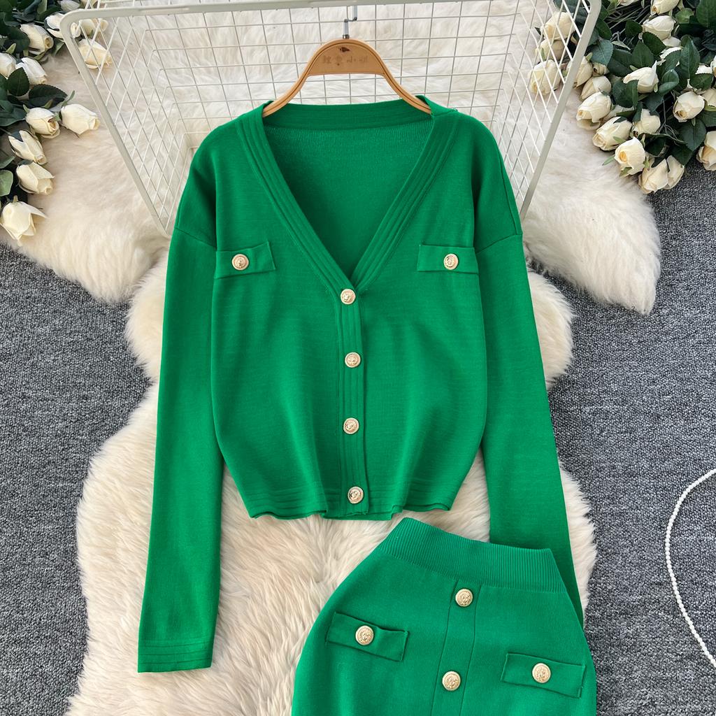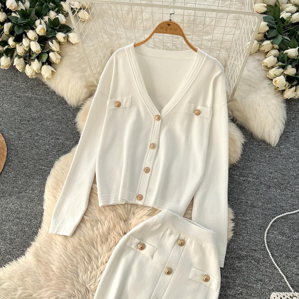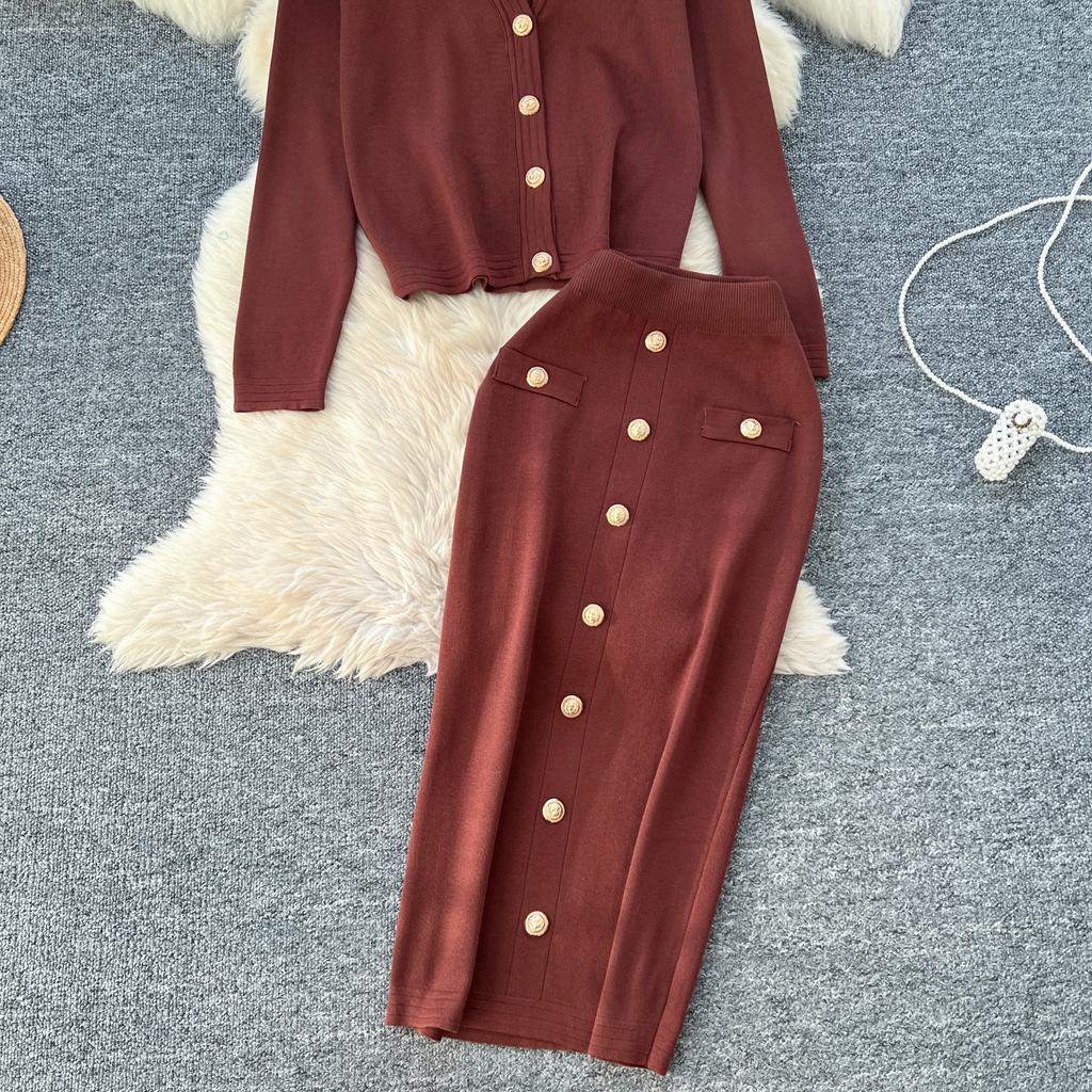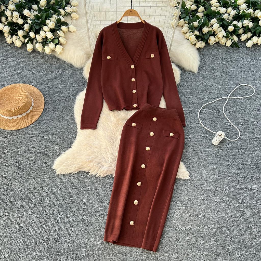 Осенне-весенний женский вязаный свитер из двух предметов: однобортное пальто с V-образным вырезом и узкая юбка-карандаш длиной до середины икры