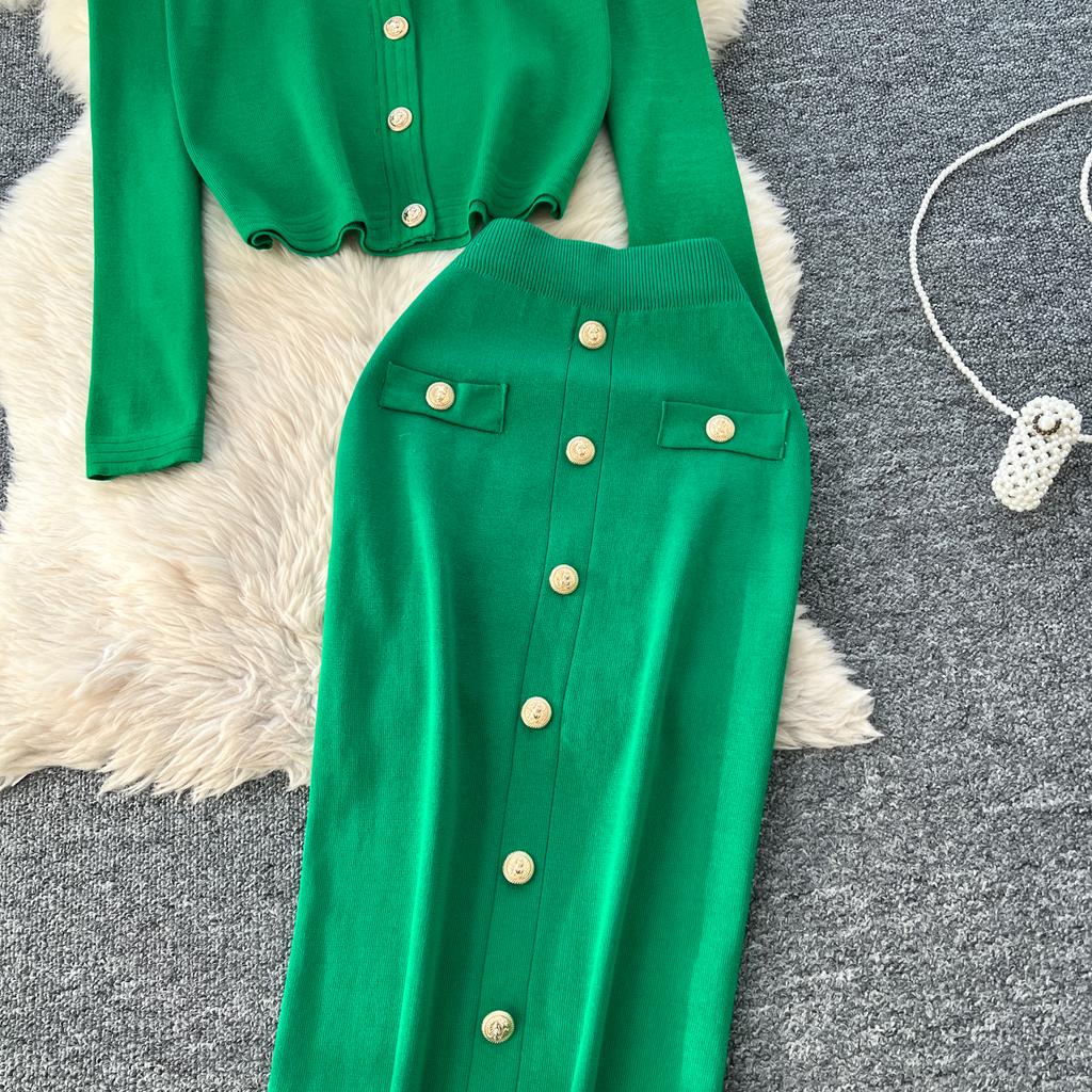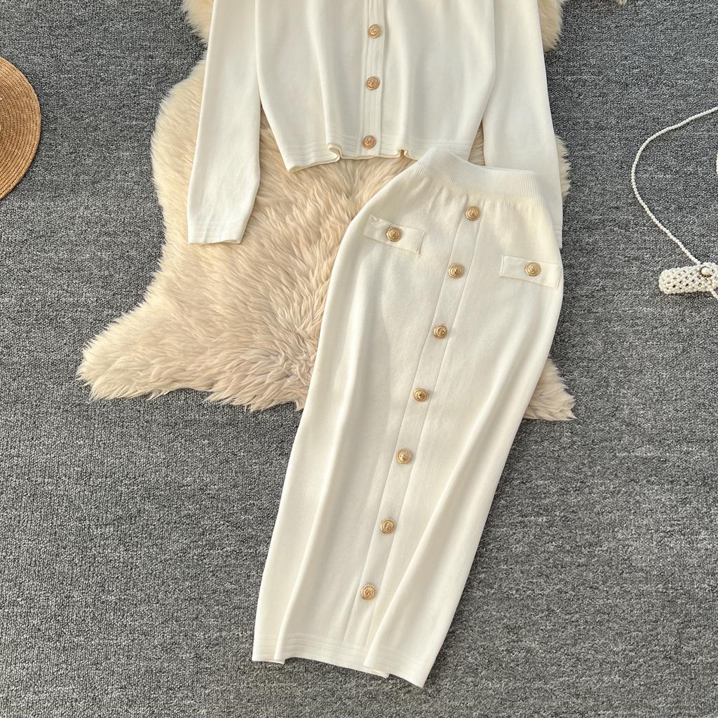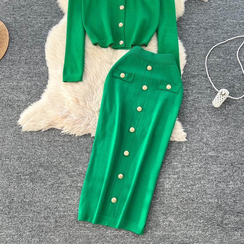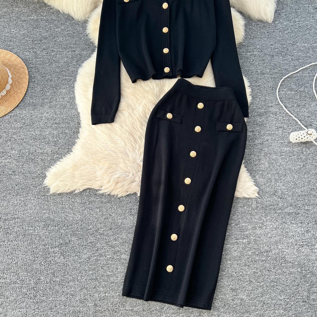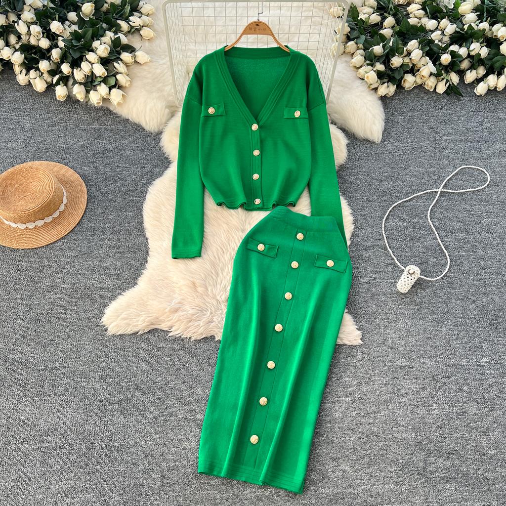 Осенне-весенний женский вязаный свитер из двух предметов: однобортное пальто с V-образным вырезом и узкая юбка-карандаш длиной до середины икры