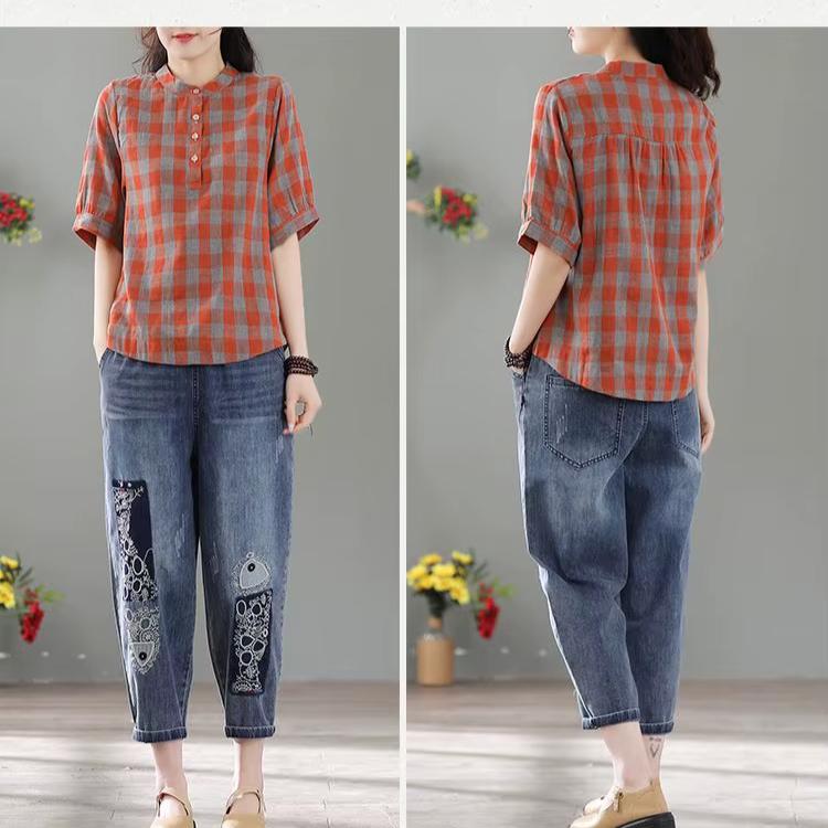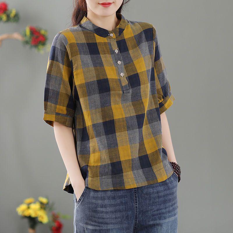 Летняя модная винтажная клетчатая блузка женская классическая с коротким рукавом и пуговицами, свободная повседневная универсальная женская рубашка-пуловер