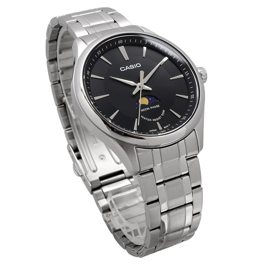 Casio Стандартные аналоговые часы с фазами Луны, круглый циферблат, металлический ремешок, черный, модель Overseas [Casio] мужские MTP-M100D-1AV [Товар]