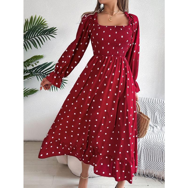 Осенне-зимнее повседневное платье с деревянными ушками сбоку и квадратным воротником в горошек с длинными рукавами