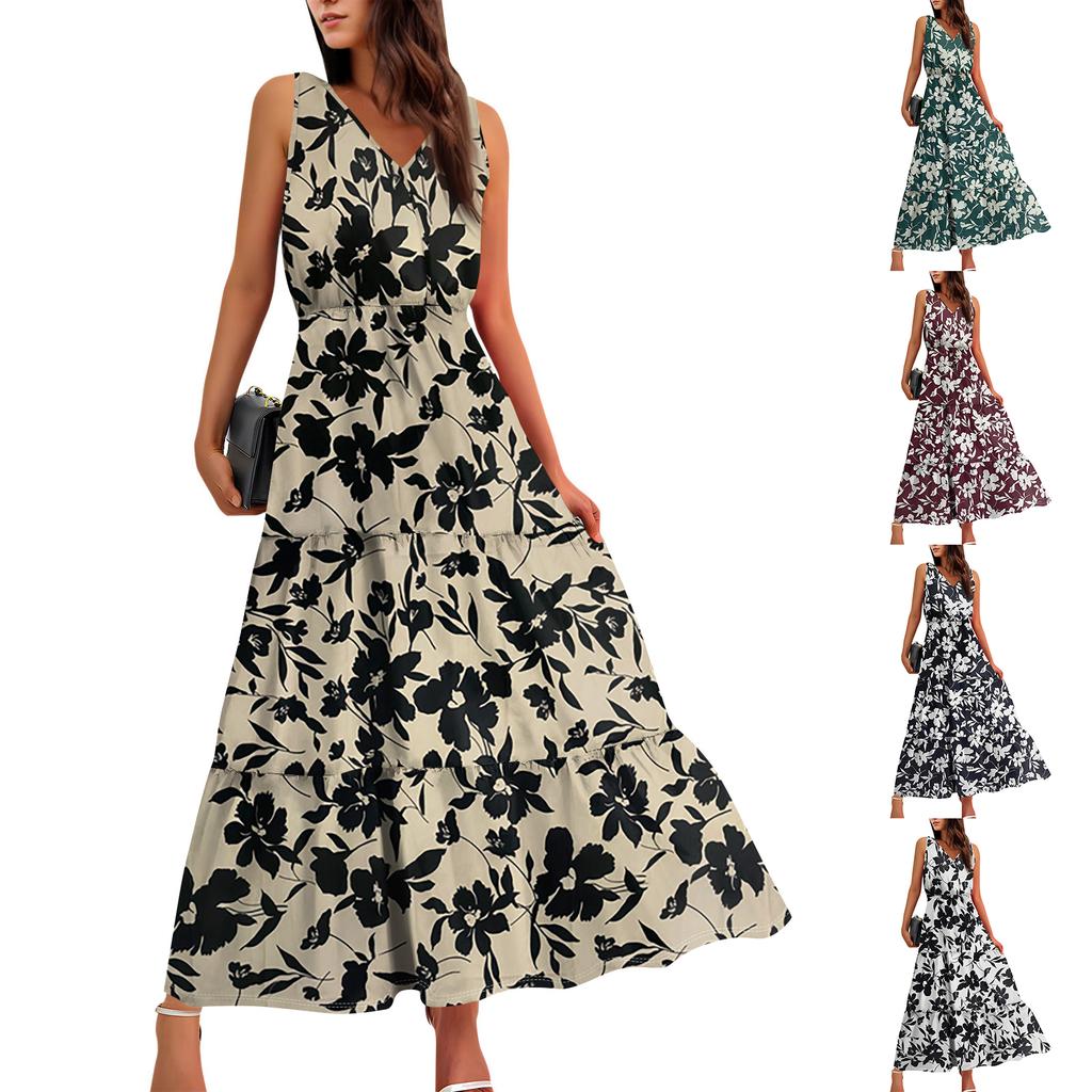 Женские струящиеся платья Женские летние платья Повседневные длинные платья без рукавов Милые длинные платья с цветочным принтом