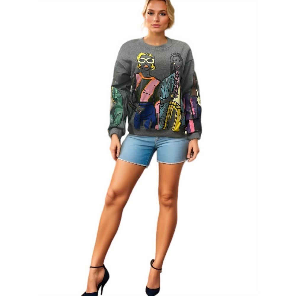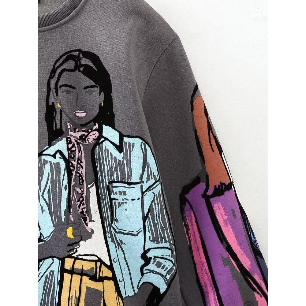 Осенне-зимняя женская теплая утепленная без капюшона круглая горловина свободная спортивная толстовка с принтом