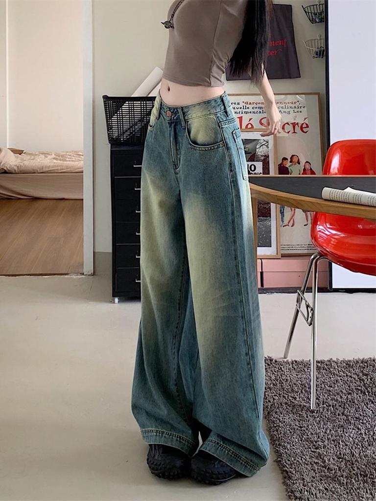Женские джинсы 2024 года в стиле ретро с синими потертостями, широкие — свободные повседневные прямые брюки на весну и лето