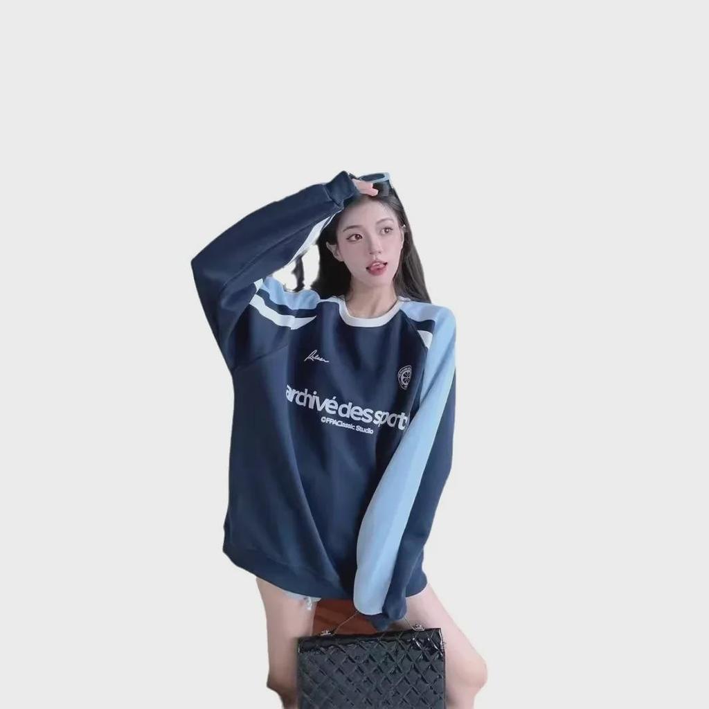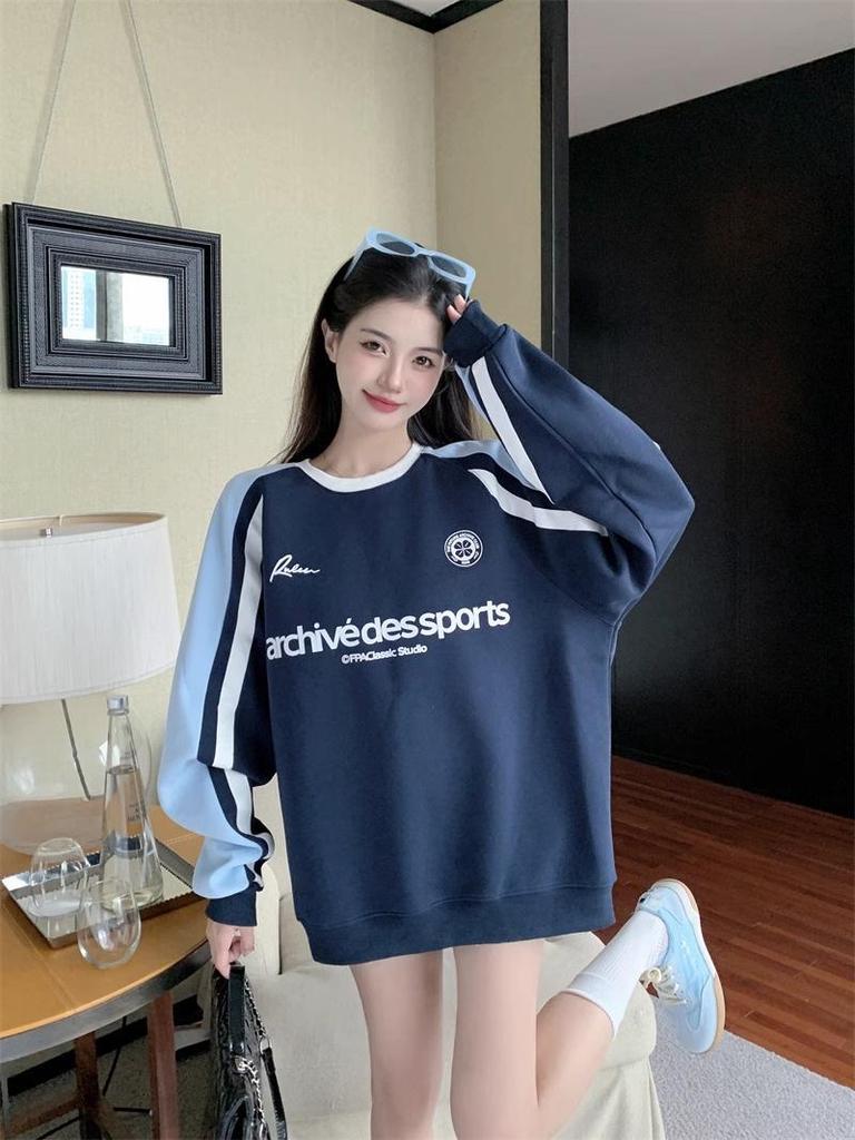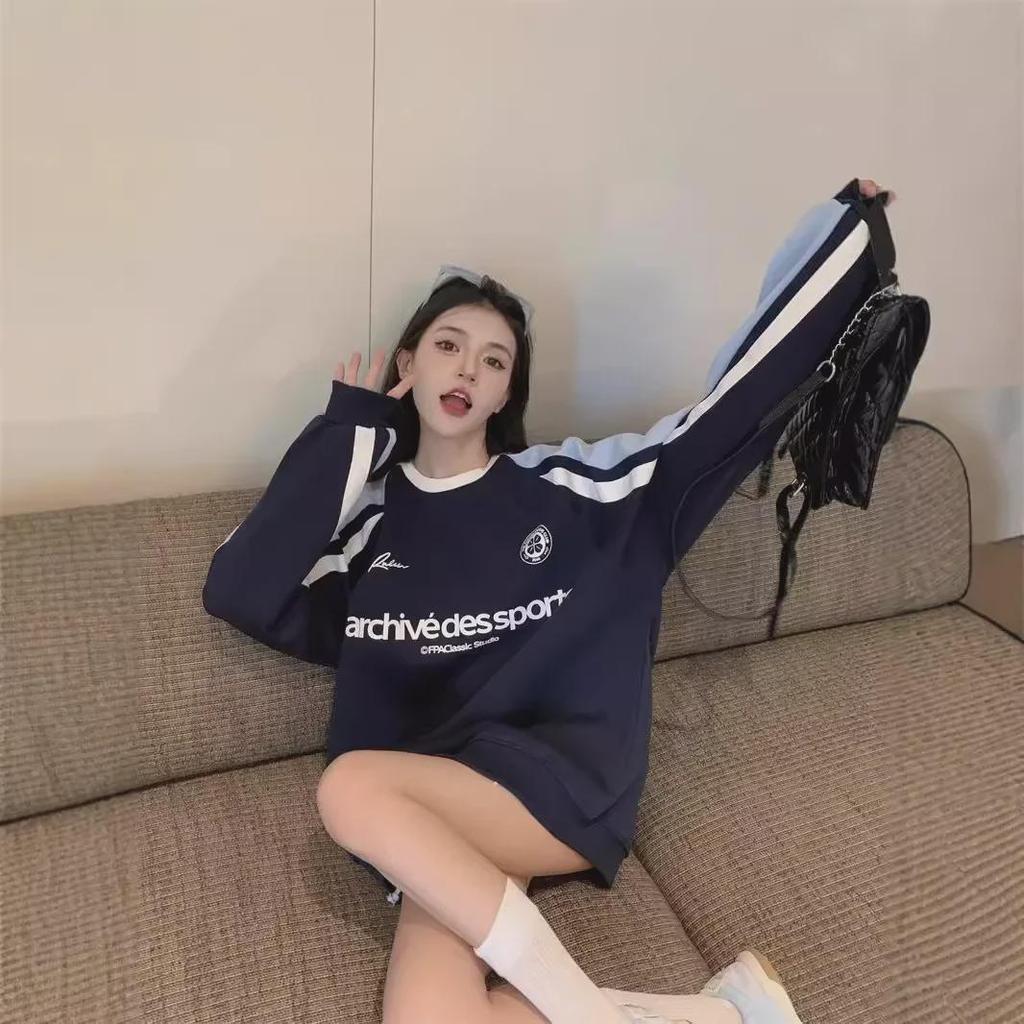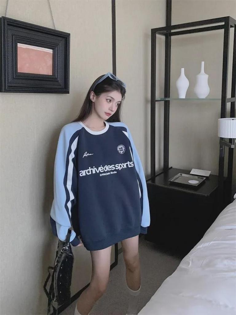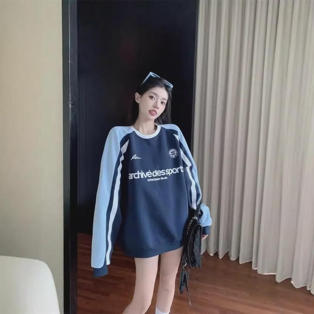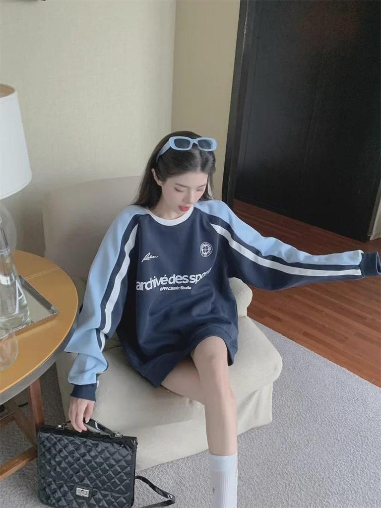 Женская толстовка с круглым вырезом контрастного цвета - повседневный свободный спортивный топ средней длины для осени/зимы 2024 г.