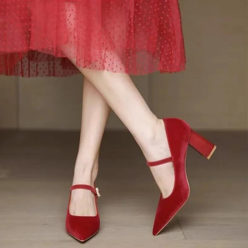 2025 Женская обувь Мэри Джейн Женские туфли на высоком каблуке Модные туфли-лодочки Женские туфли с острым носком и пряжкой на ремешке на толстом каблуке Женские