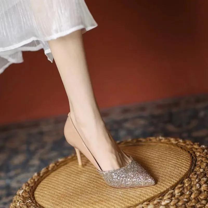Туфли женские 2025 Slip on женские туфли на высоком каблуке модные туфли-лодочки женские с острым носком блестящие тонкие каблуки неглубокие туфли женские Zapatos