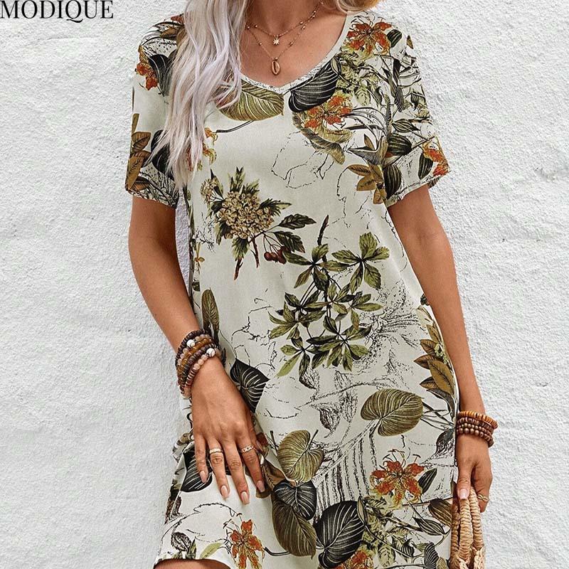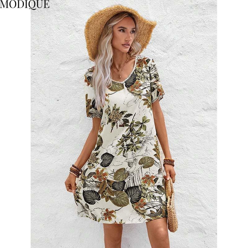 MODIQUE 2025 Лето Новое Женское Повседневное Платье с Цветочным И Растительным Принтом Meah Короткое Женское Платье Ретро Трапециевидной Формы С V-образным Вырезом