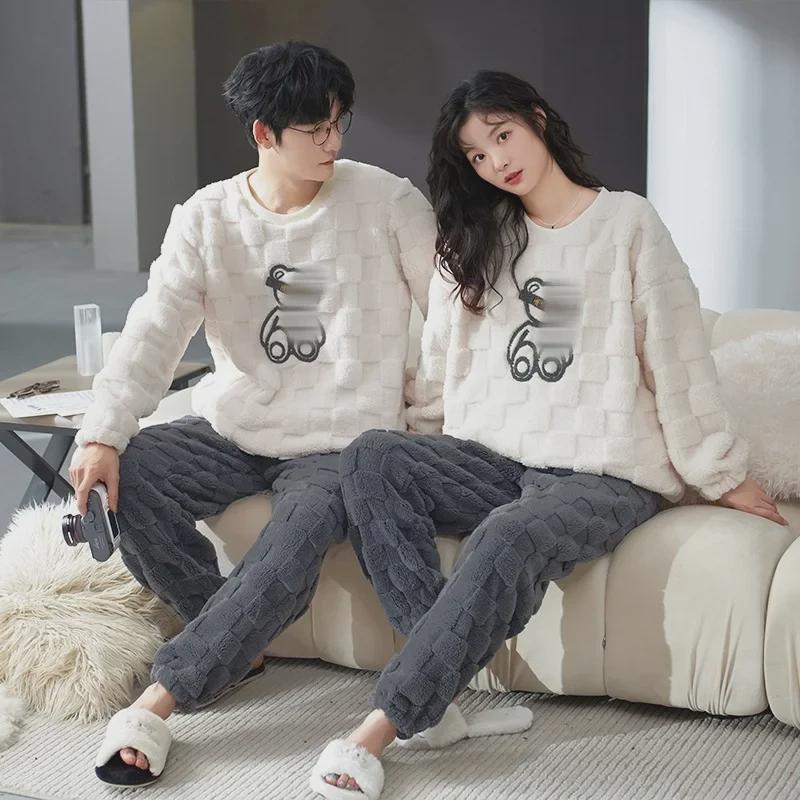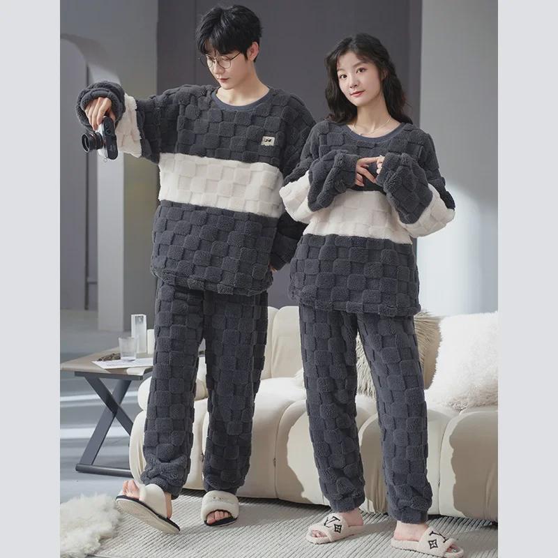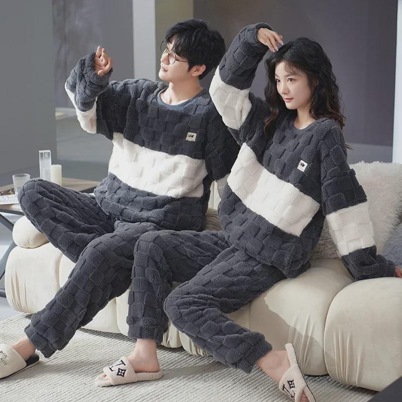 Пижама для пар из бархата кораллового цвета, жаккард, осень/зима - длинный рукав, круглый вырез, большой размер