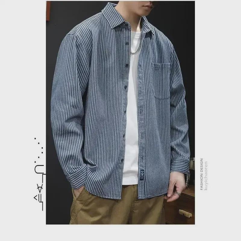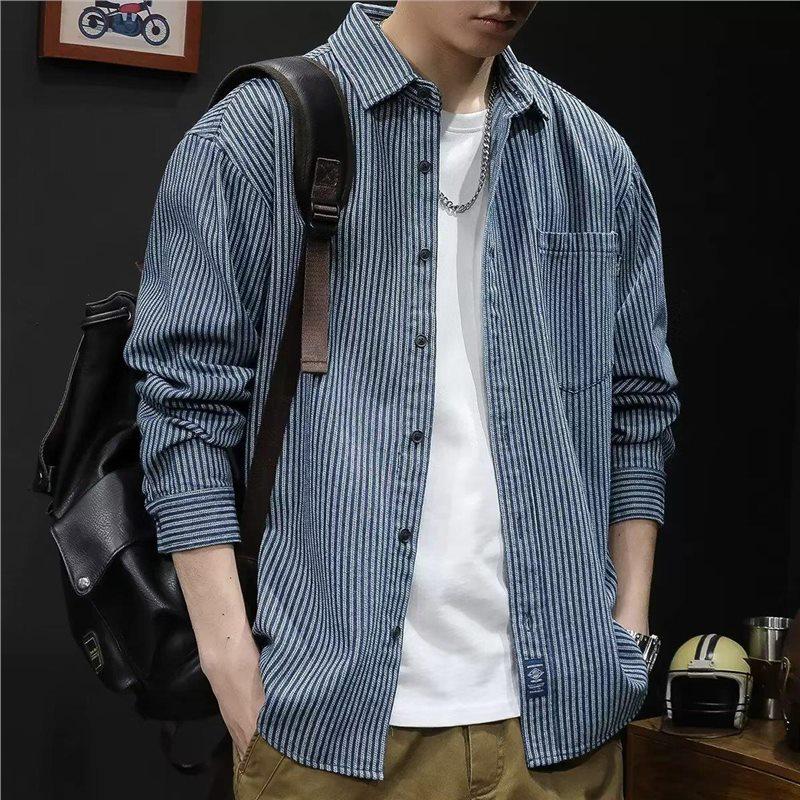 Мужская осенняя полосатая джинсовая рубашка с длинным рукавом: Японская повседневная универсальная синяя куртка