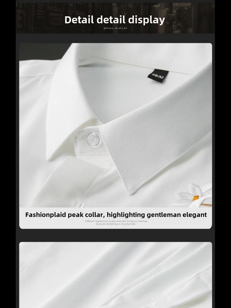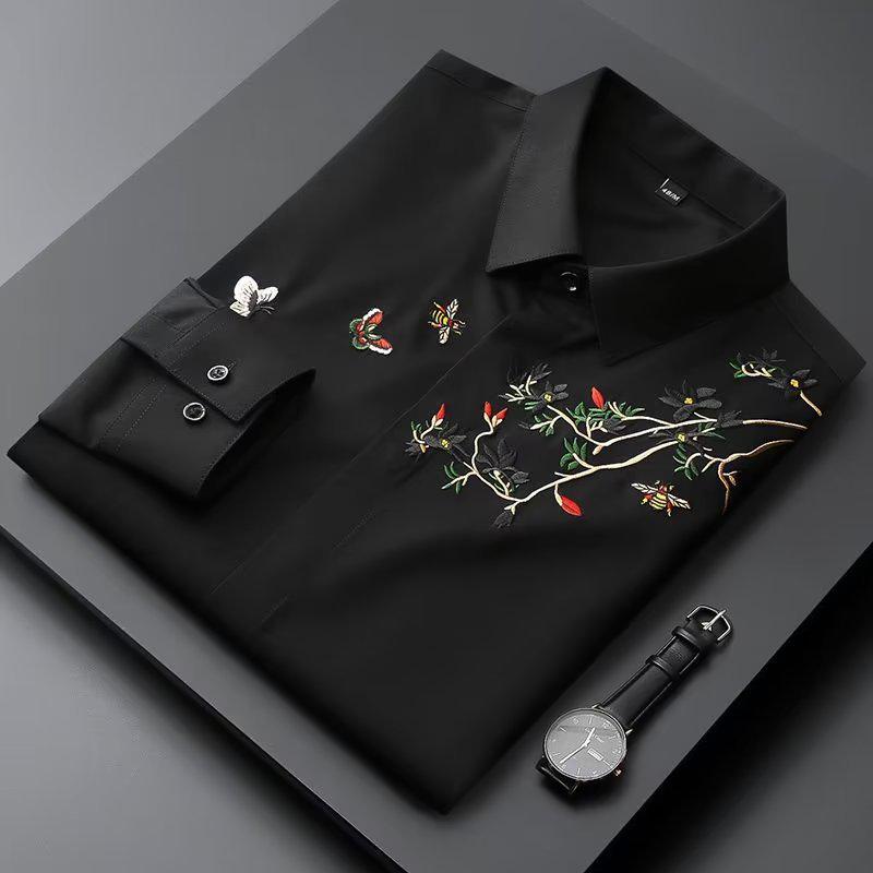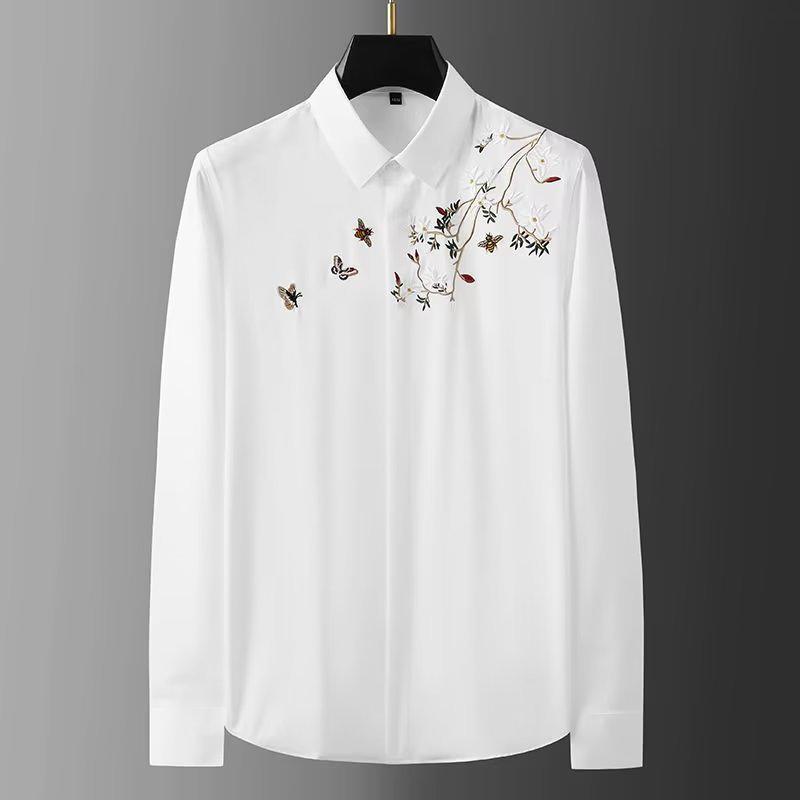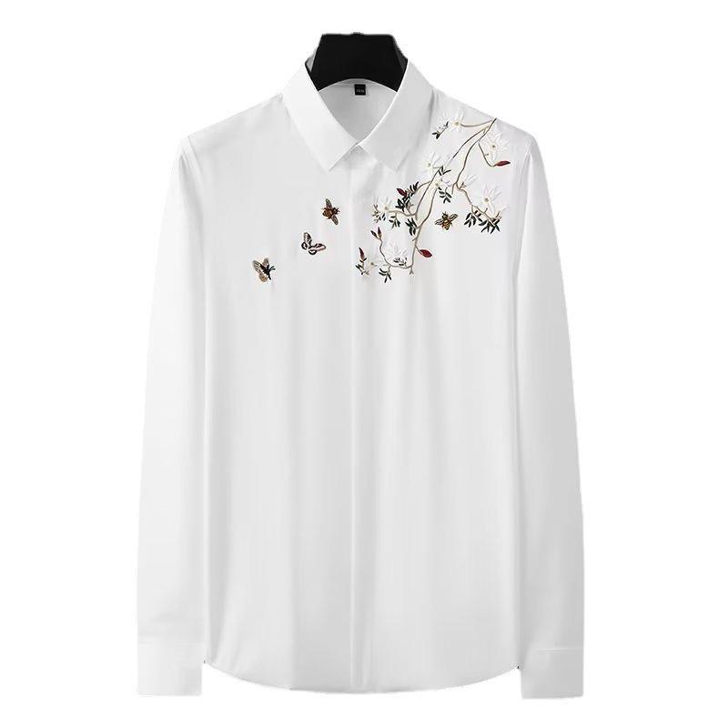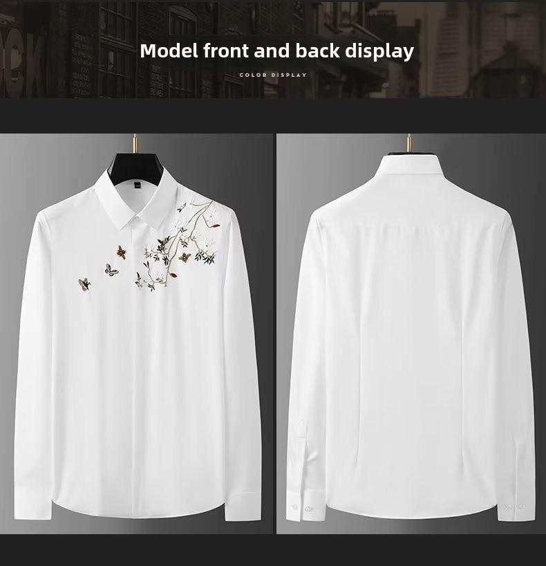 Мужская белая рубашка узкого кроя с длинным рукавом и китайской вышивкой - осень 2023 г., повседневная и не мнется