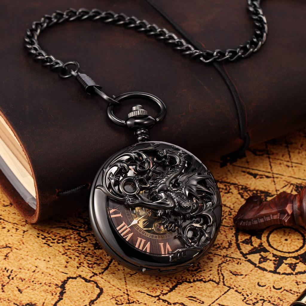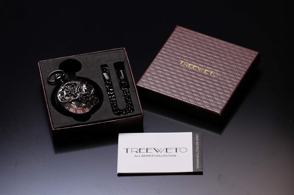 Механические карманные часы TREEWETO с драконом и скелетоном на цепочке с ручным заводом, двухсторонней крышкой, водяными знаками,