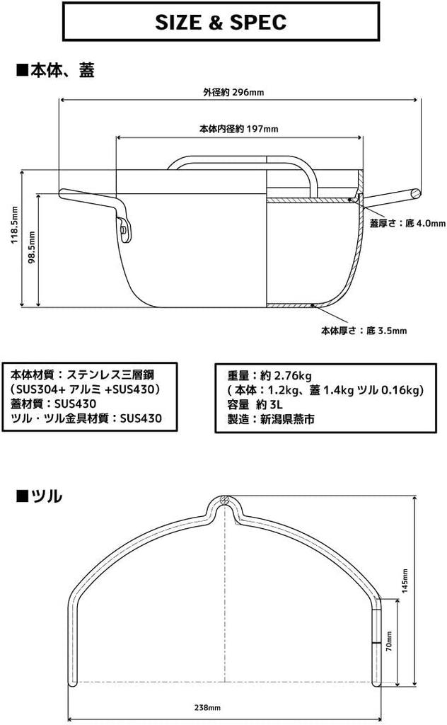 [Совместим со всеми источниками тепла, такими как IH] Совместим со всеми источниками тепла, такими как IH 200 В, 100 В, газовый камин, галогенный обогреватель, закрытый обогреватель и т. д.. Также возможна безводная готовка, при которой для приготовления пищи используется влага, содержащаяся в ингредиентах, без использования воды.. Вы можете использовать вкус и питательные вещества таких ингредиентов, как мясо и овощи, не оставляя ничего. Крышка и корпус плотно прилегают друг к другу, сохраняя вкус пищи и предотвращая внезапное выкипание.. Основной корпус имеет прекрасную зеркальную полировку, выполненную полировщиком из Цубаме.. Материал корпуса: Трехслойная нержавеющая сталь (SUS304+Алюминий+SUS430) Материал крышки: SUS430 Материал металлических фитингов крана: Вес SUS430: приблизительно. 2.76кг (Основная часть: 1,2 кг, крышка 1,4 кг, кран 0,16 кг) Размер: Толщина корпуса 3,5 мм, толщина крышки 4 мм Диаметр корпуса: приблизительно. 197мм, глубина (изнутри тела): приблизительно. 95мм, высота (с крышкой): приблизительно. 128мм Внешние размеры: Ширина: приблизительно. 296мм (включая ручку) Вместимость: приблизительно. 3.0L Производитель: Город Цубаме, префектура Ниигата