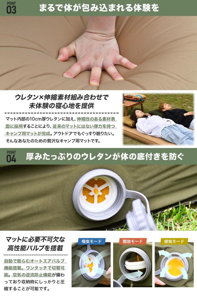 Представляем коврик для сна в автомобиль/кемпинг толщиной 10 см, на котором еще удобнее спать, от популярного бренда товаров для активного отдыха [WAQ]! Незаменимый автомобильный коврик, матрас и надувной коврик для активного отдыха на свежем воздухе! Уретановый коврик! [Для тех, кто не хочет жертвовать своим сном даже во время кемпинга] Материал подушки изготовлен из уретана, который обладает превосходной эластичностью.. Более того, изменив направление перфорации с ромбовидной формы на горизонтальное, мы добились приятной эластичности уретана, не нарушив при этом натяжение коврика из-за воздуха! [Широкая конструкция, которой могут пользоваться два человека! ] Расслабляющий кемпинговый коврик Double Size — это размер, на котором могут комфортно разместиться двое взрослых.. Благодаря ширине 134 см он устраняет скованность, возникающую при сне на обычных матрасах.. [Толстый уретан] Сверхтолстый уретан толщиной до 10 см надежно поддерживает ваше тело. В сочетании с эластичной тканью комфорт сна еще больше повысился.. [Автоматическое надувание] Когда вы открываете клапан, воздух автоматически поступает внутрь! Кроме того, он оснащен высокопроизводительным клапаном, который предотвращает обратный поток воздуха и обеспечивает более эффективный забор воздуха.. *Первое надувание занимает около 10–15 минут, так как забор воздуха происходит медленно из-за заводских условий.. [Устранение нарушений сна]