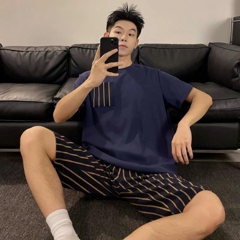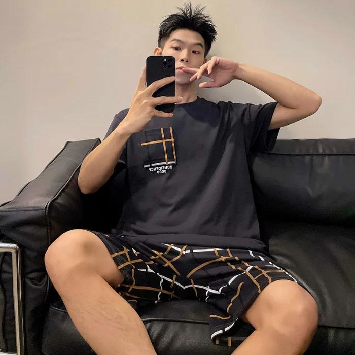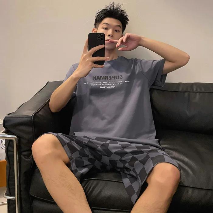 Высококачественный хлопок, мужской пижамный комплект с круглым вырезом, для молодых студентов, домашняя одежда, простая однотонная одежда для сна в полоску с буквами, одежда для отдыха