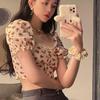 Летний топ с цветочным узором и вафельной сеткой, квадратным вырезом, рукавами-пузырьками и открытым пупком для женщин