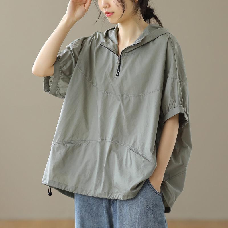 Футболка с капюшоном женская летняя художественная большого размера свободная повседневная футболка с короткими рукавами на молнии модные солнцезащитные топы
