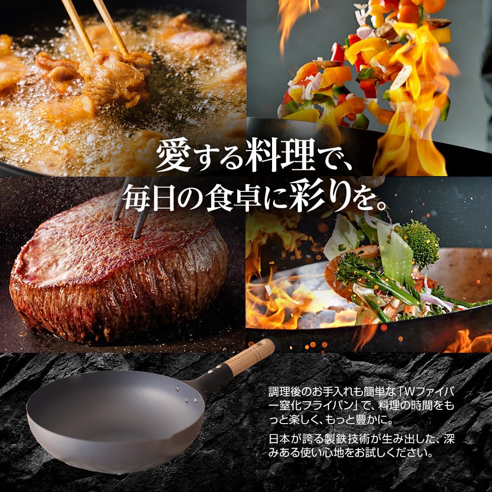 «Кулинария — мое хобби, но сковорода легко застревает...» Для тех из вас, у кого есть такая проблема. Процесс приготовления должен быть увлекательным, не так ли? Однако, поскольку сковороды имеют тенденцию пригорать, их очистка после приготовления пищи может стать большой проблемой.. Удовольствие от готовки сократится вдвое. Подобные проблемы решаются с помощью «Сковороды с азотированием волокна W»! Специальное чистое железо с синей закалкой и специальная термическая обработка двойного волокна обеспечивают как устойчивость к прилипанию, так и долговечность.. Этот высококачественный ингредиент, которым гордится Япония, делает приготовление пищи более комфортным и приятным.
