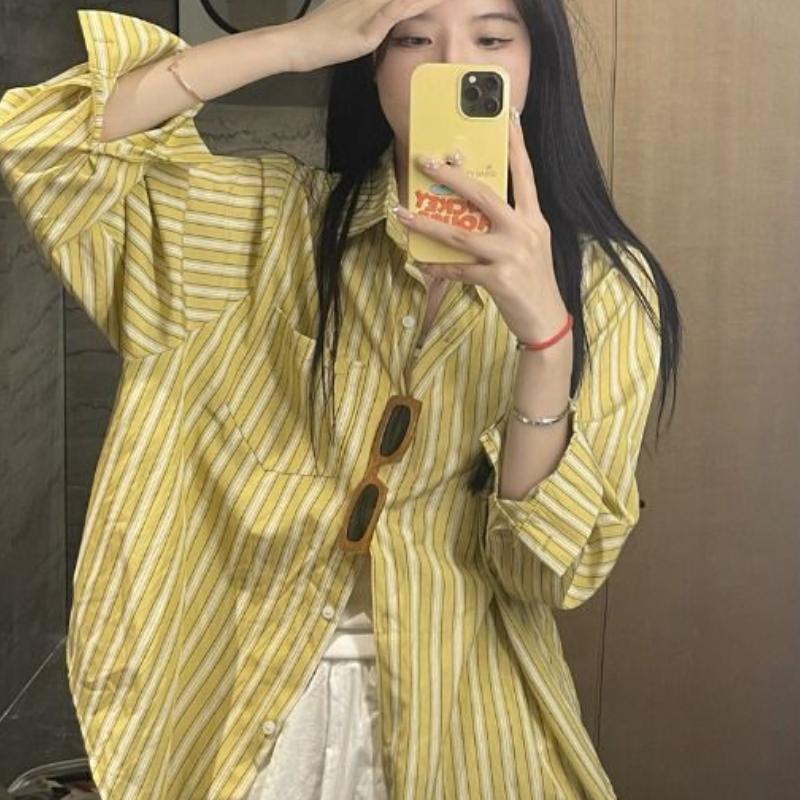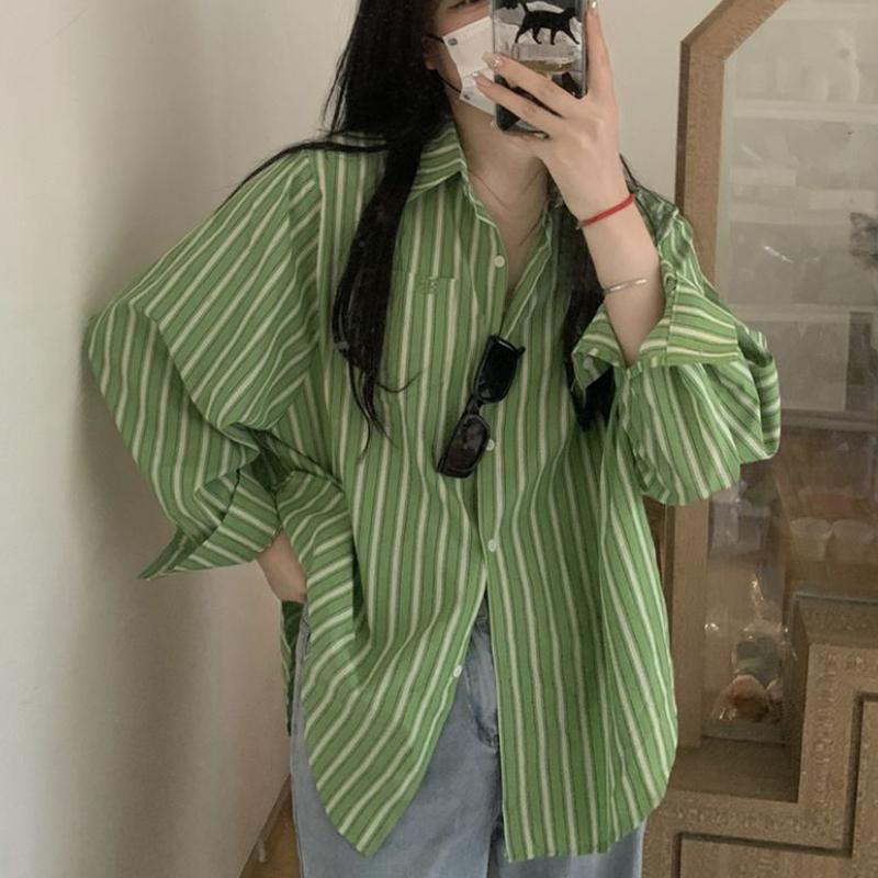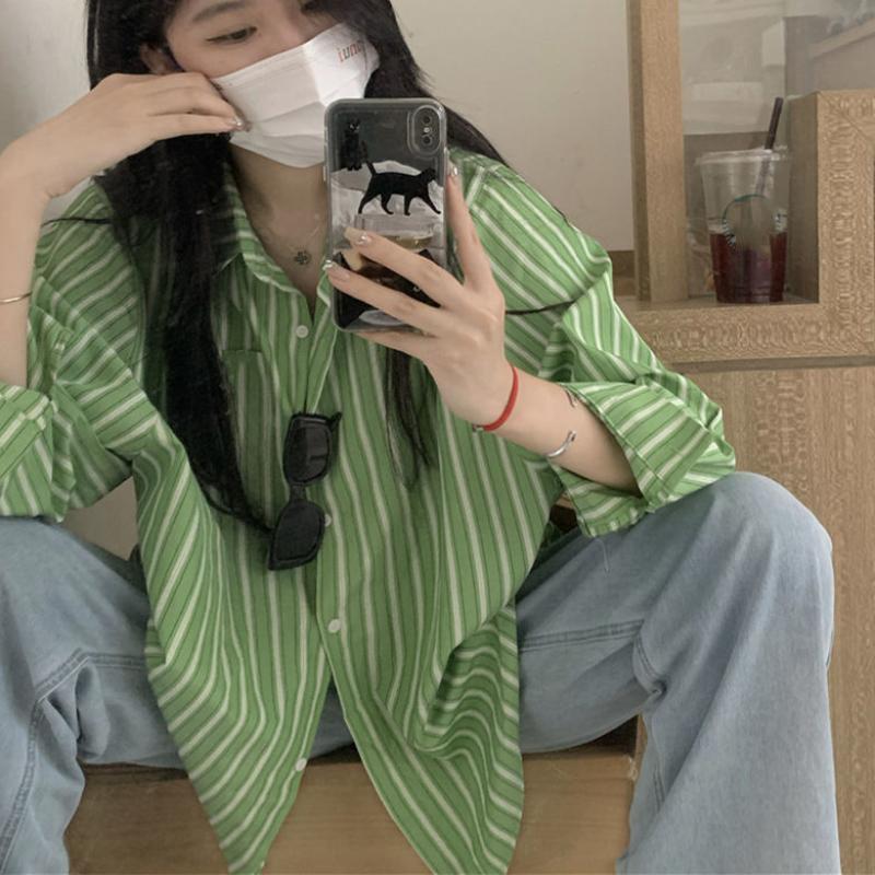 Женская зеленая полосатая рубашка, свободная и повседневная рубашка с длинными рукавами, универсальное солнцезащитное верхнее пальто