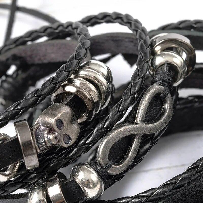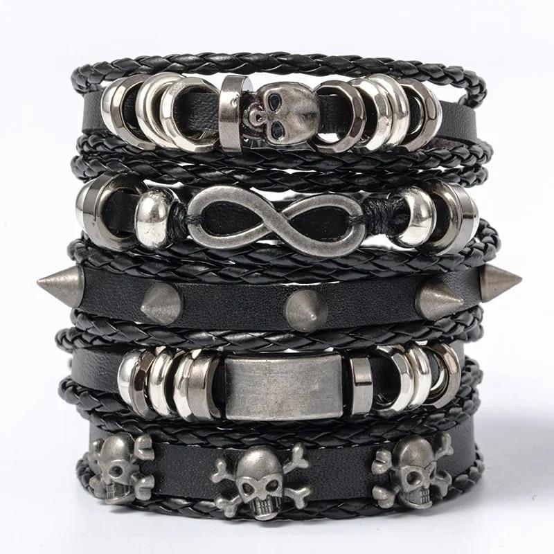 Набор из 5 металлических плетеных браслетов в стиле панк, с использованием искусственной кожи и бусин