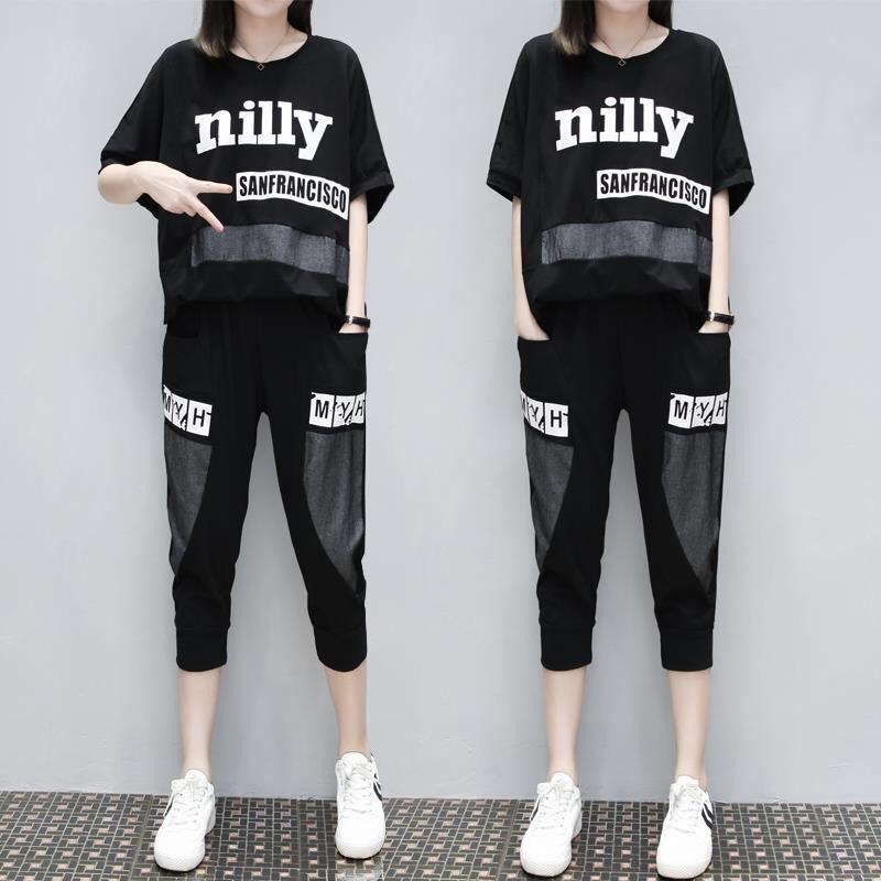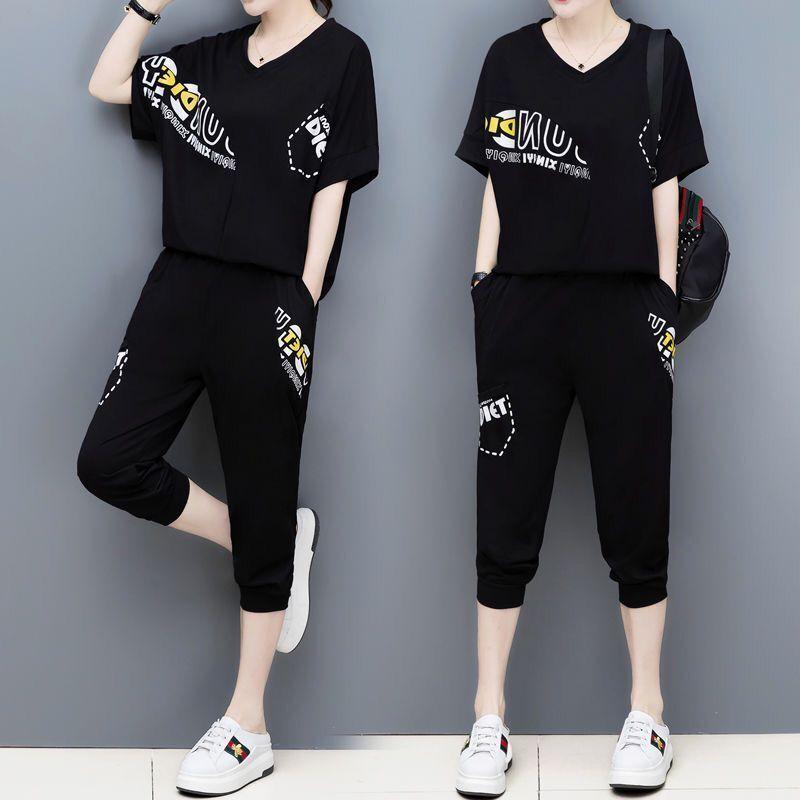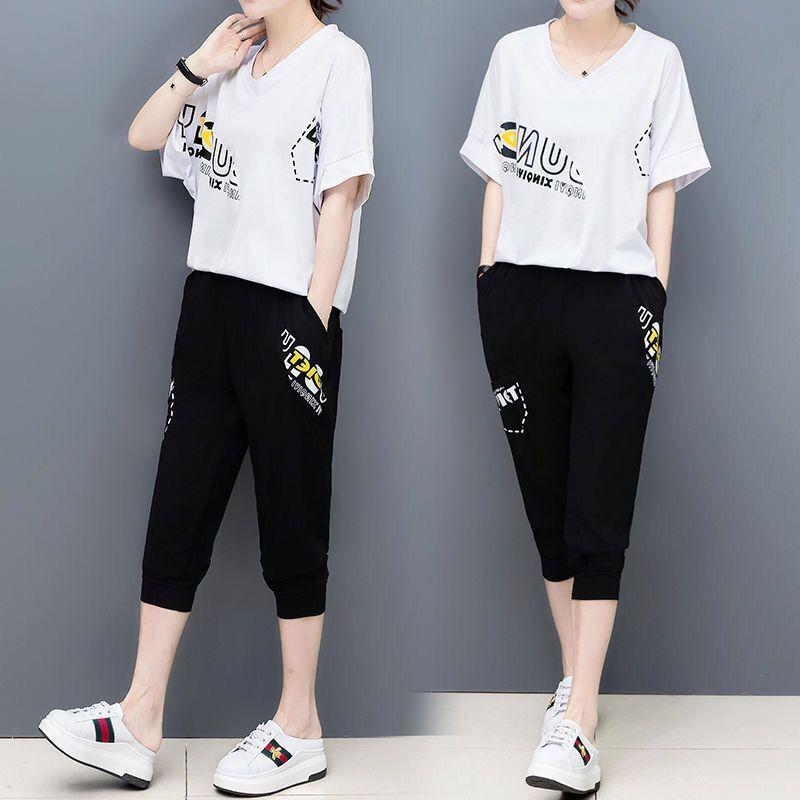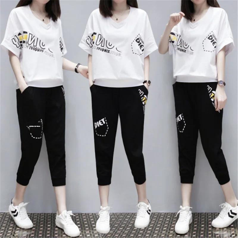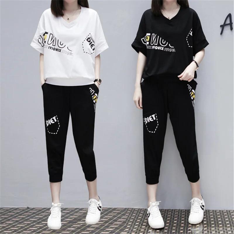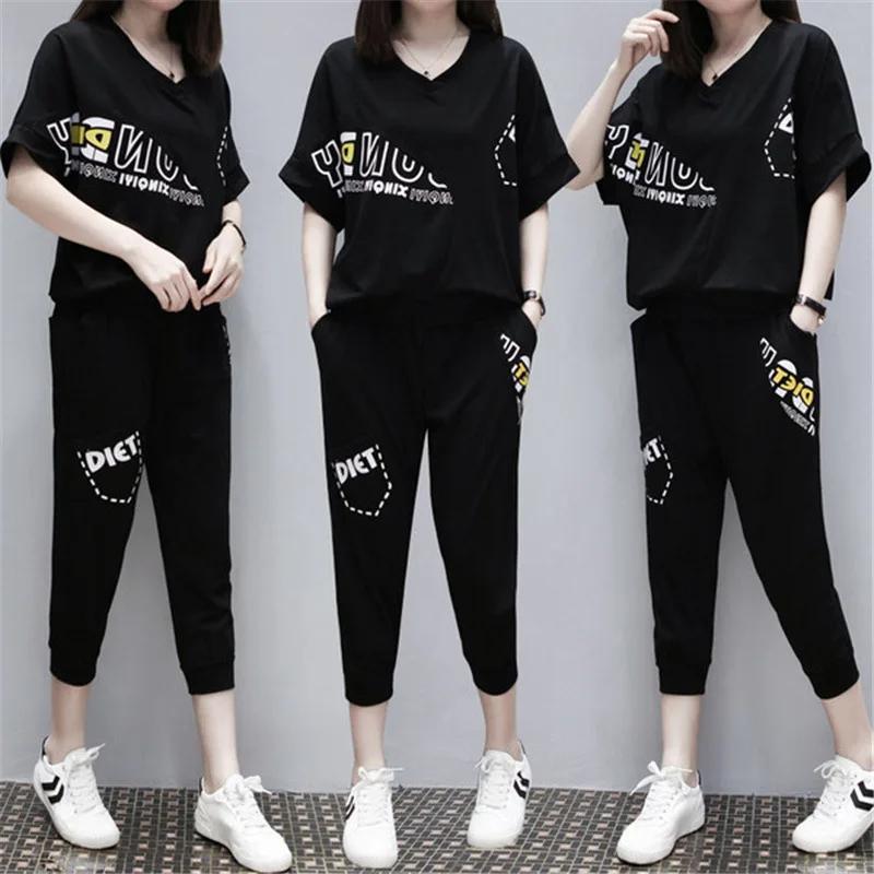 Плюс размер Летний стиль Корейская мода женский бег спортивный комплект с короткими рукавами 3/4 Длина брюки для женщин