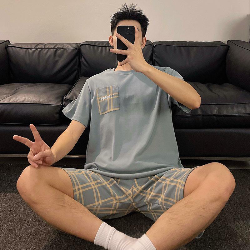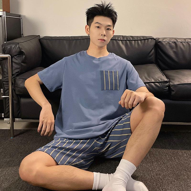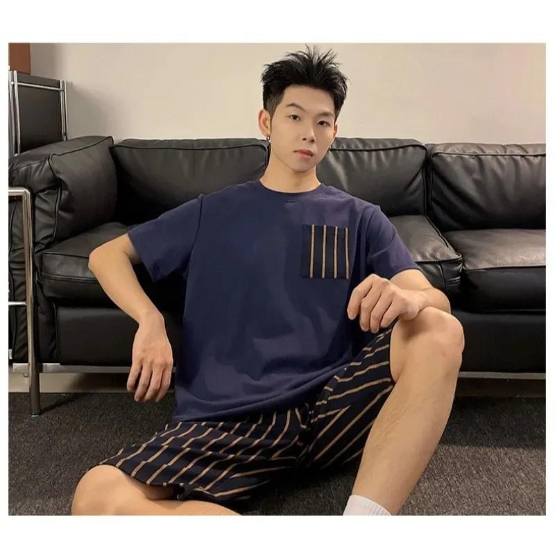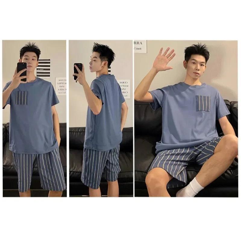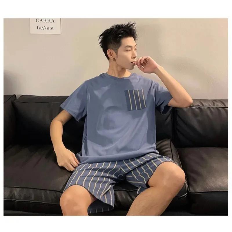 Мужской однотонный свитер с круглым вырезом в клетку, полосатые шорты, дышащая повседневная молодежная модная одежда для сна, домашняя одежда