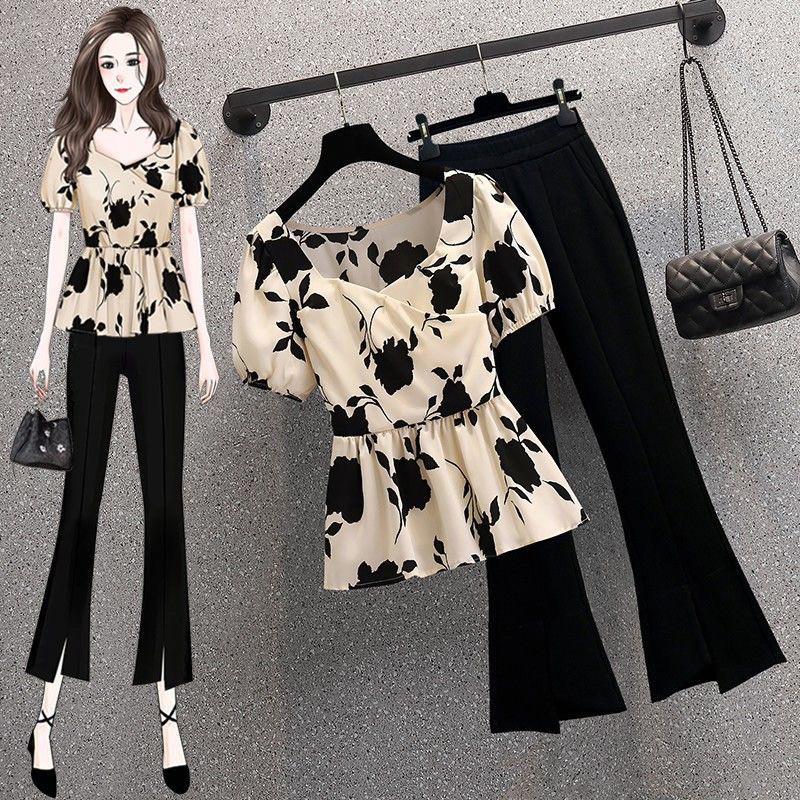 Женская летняя рубашка с короткими рукавами + микро-клеш брюки, комплект из двух частей, блузка в корейском стиле с черными брюками