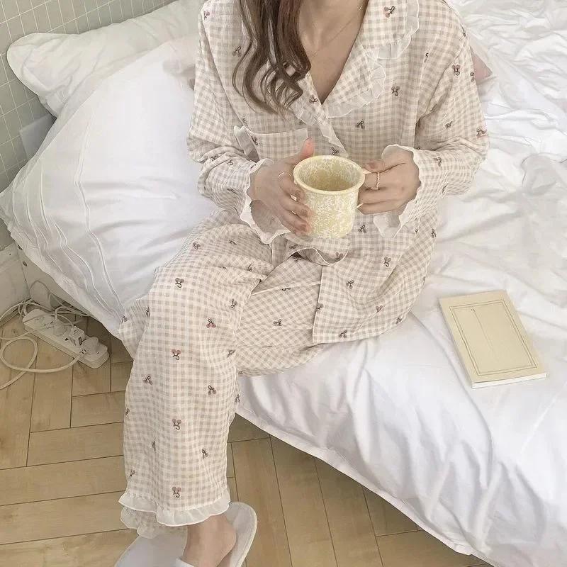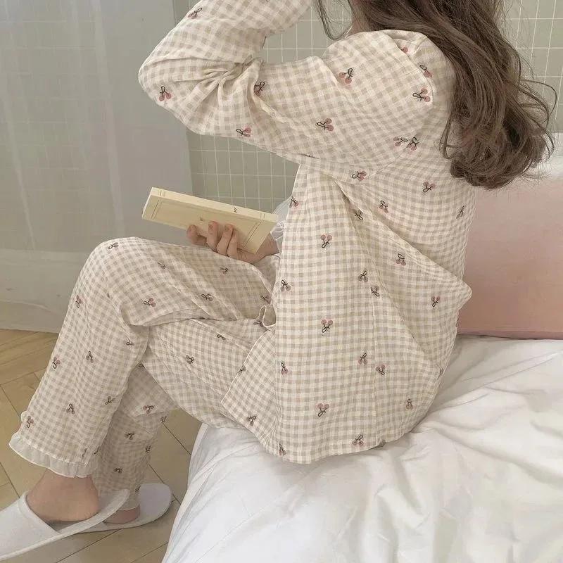 Женский шелковый клетчатый вишневый кардиган с длинными рукавами, свободный, на весну и лето, домашняя одежда, одежда для сна, комплект одежды для отдыха