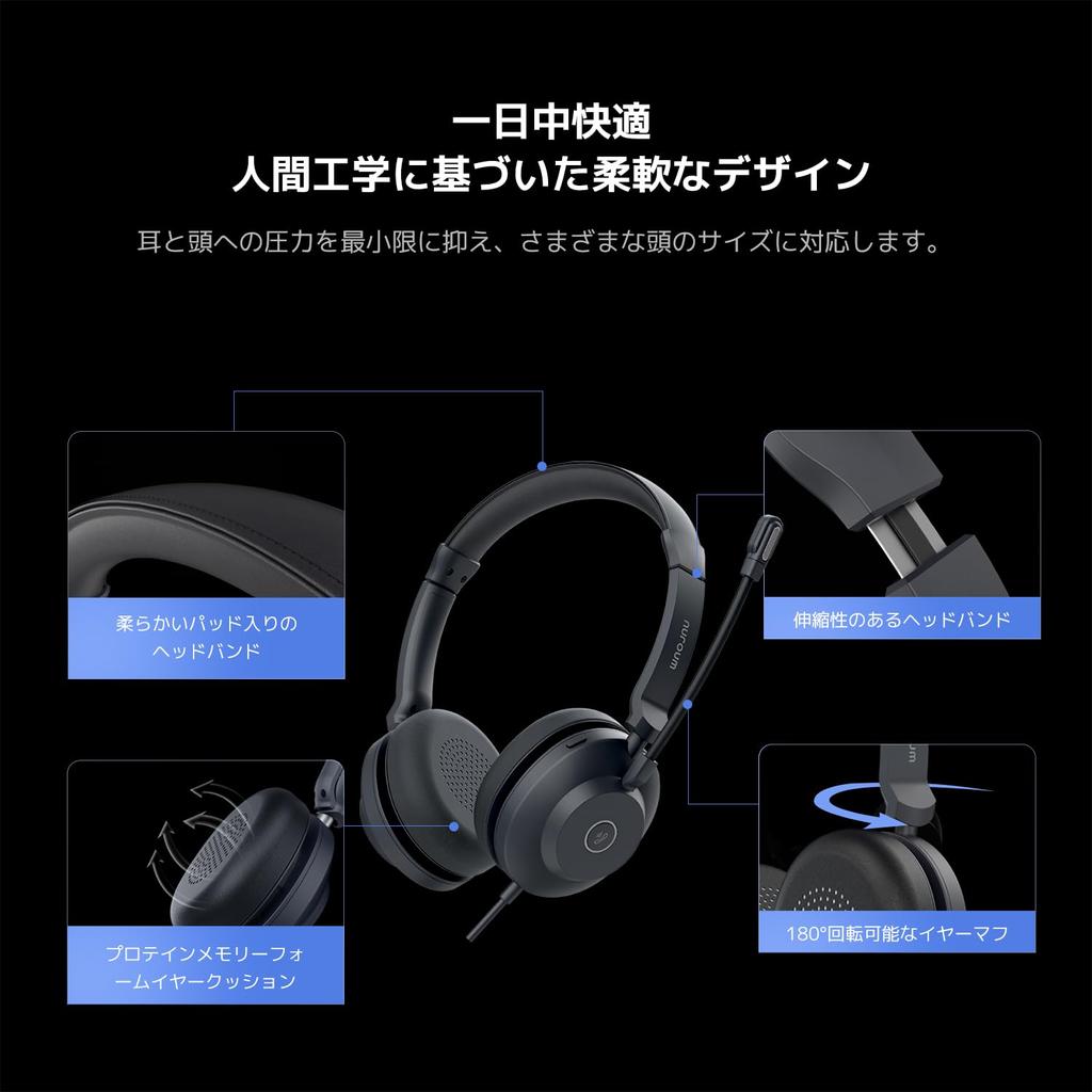 ``Простая в использовании USB-гарнитура с микрофоном'' [Гибкие настройки для индивидуального ношения] Наслаждайтесь индивидуальными вариантами ношения с помощью проводной гарнитуры. Вращающийся на 300° и сгибающийся микрофон позволяет носить его на любом ухе и располагать его точно возле рта для более четкого приема звука. Кроме того, регулируемое оголовье и вращающаяся конструкция амбушюров обеспечивают гибкую посадку на голову любой формы и размера, гарантируя удобную посадку в соответствии с вашими предпочтениями.